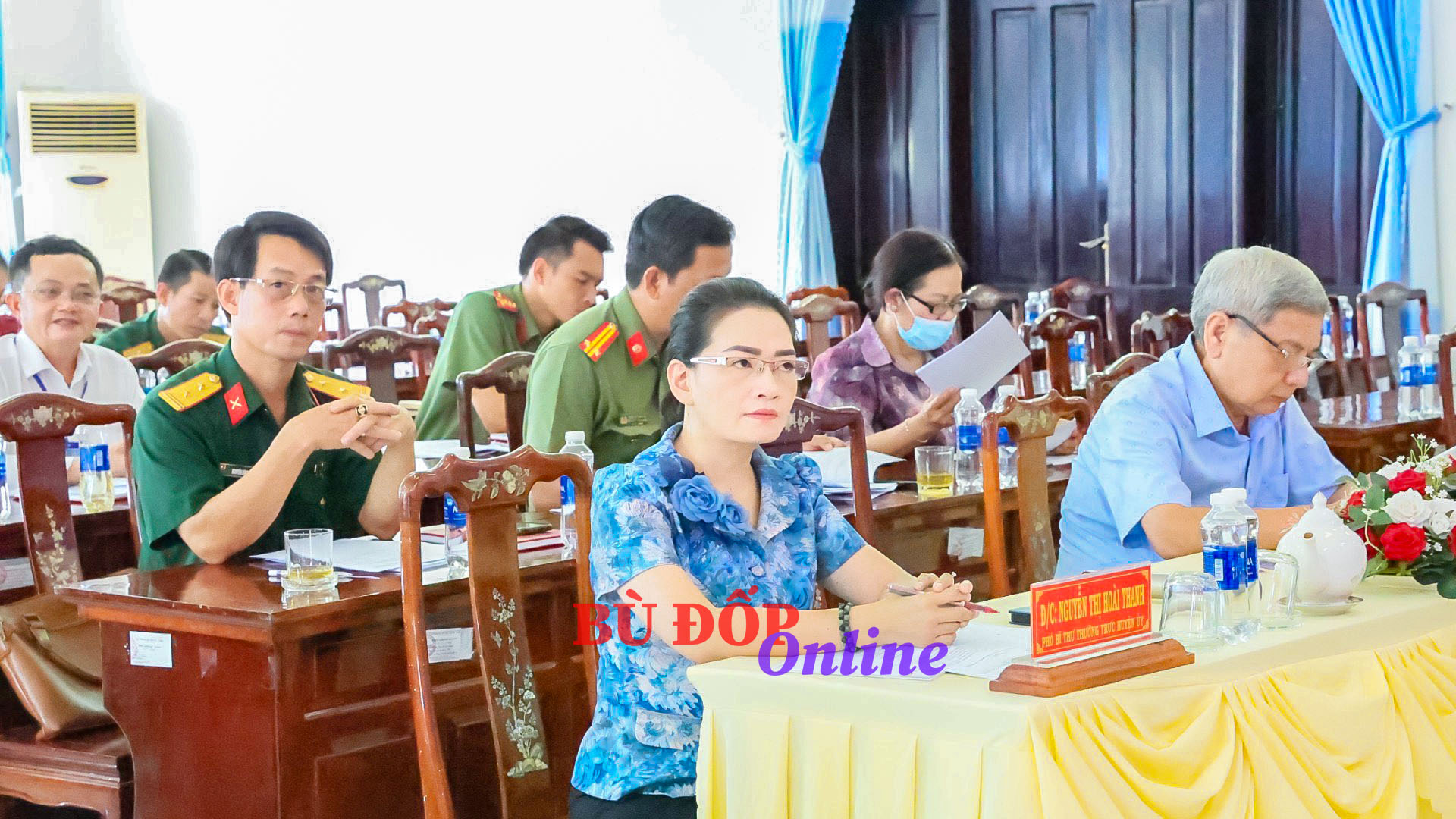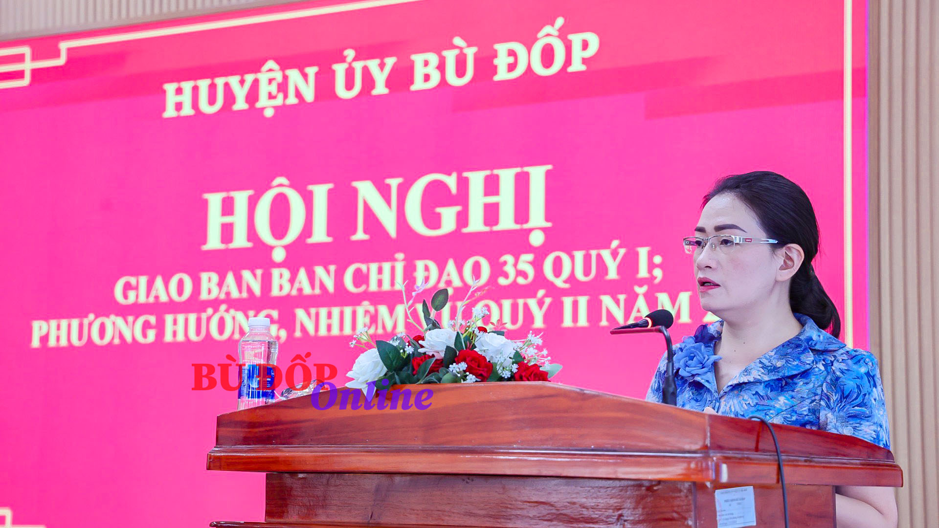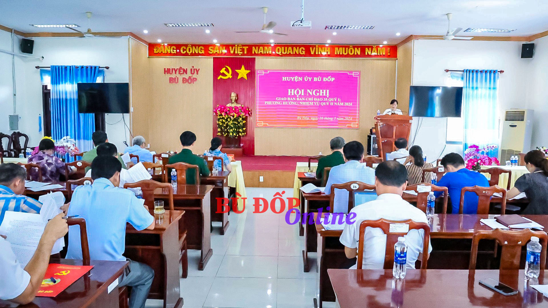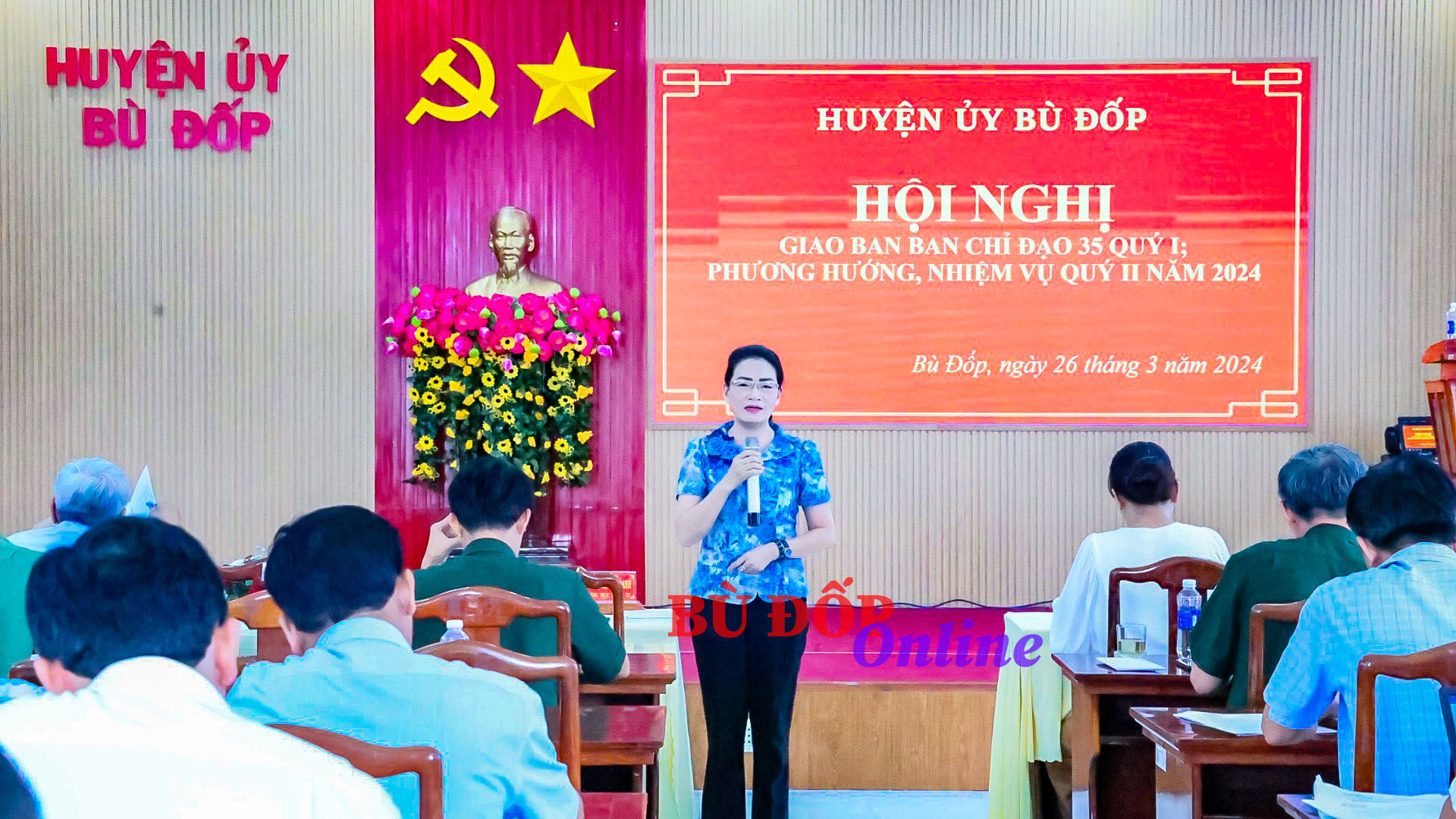 Chiều 26/3/2024, Ban Chỉ đạo (BCĐ) 35 huyện Bù Đốp tổ chức hội đánh giá hoạt động quý I/2024, triển khai nhiệm vụ quý II/2024. Đồng chí Nguyễn Thị Hoài Thanh, Phó bí thư Thường trực Huyện ủy, Trưởng BCĐ 35 huyện trì hội nghị. Tham dự Hội nghị còn có các thành viên BCĐ, Tổ thư ký giúp việc BCĐ 35 huyện.