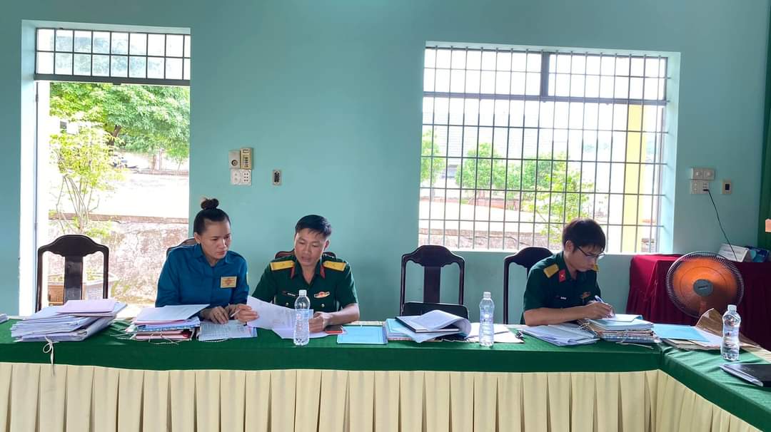 Đoàn công tác của Ban CHQS huyện làm việc tại xã Thiện Hưng (ảnh Phát Thành)