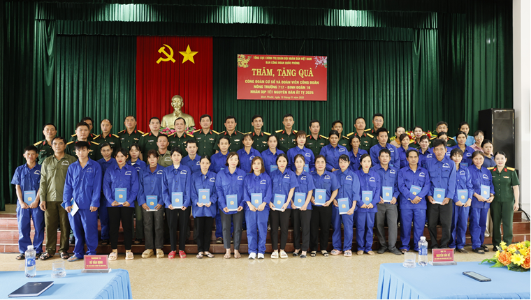 Ngày 15-1, đoàn công tác của Ban Công đoàn Quốc phòng đã đến thăm, tặng quà Công đoàn cơ sở, cán bộ đoàn viên công đoàn mắc bệnh hiểm nghèo, có hoàn cảnh khó khăn, gia đình chính sách thuộc Trung đoàn 717 nhân dịp Tết nguyên đán Ất Tỵ năm 2025.