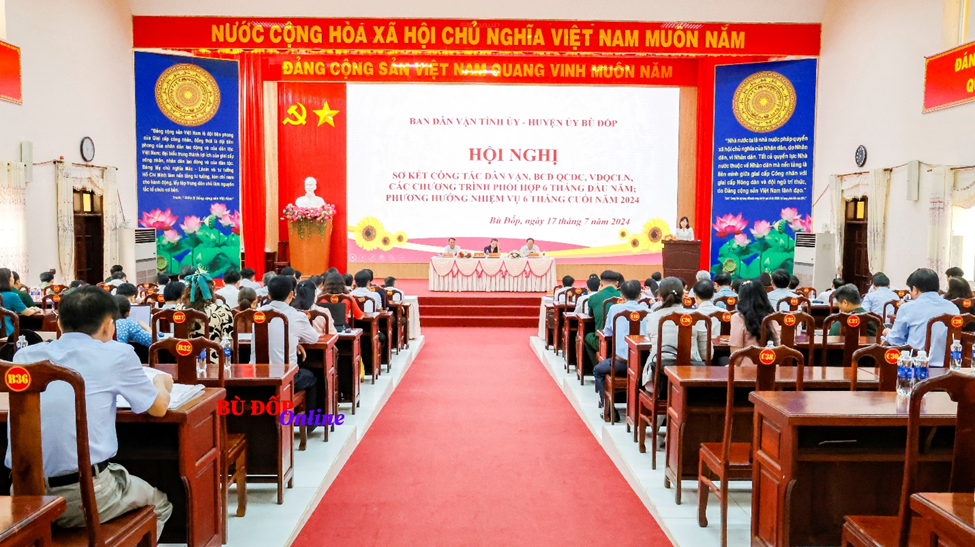 Sáng ngày 17/7, Ban Dân vận Tỉnh ủy phối hợp với Huyện ủy Bù Đốp tổ chức hội nghị sơ kết công tác dân vận, Ban chỉ đạo quy chế dân chủ, Ban chỉ đạo vận động quần chúng liên ngành, các chương trình phối hợp 6 tháng đầu năm 2024, triển khai phương hướng, nhiệm vụ 6 tháng cuối năm.