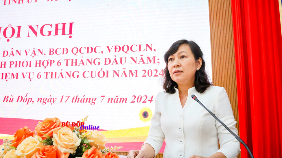 Dự chỉ đạo hội nghị có Phó Bí thư Thường trực Tỉnh uỷ, Chủ tịch HĐND tỉnh Huỳnh Thị Hằng; Uỷ viên Ban Thường vụ, Trưởng Ban Dân vận Tỉnh uỷ Lê Thị Xuân Trang; Phó trưởng ban dân vận Trịnh Thanh Tuệ; Tỉnh ủy viên, Bí thư Huyện ủy Bù Đốp Dương Thanh Huân chủ trì hội nghị. Dự hội nghị có Phó bí thư Thường trực Huyện ủy Bù Đốp Nguyễn Thị Hoài Thanh; đại diện lãnh đạo các sở, ban ngành, đại diện lãnh đạo Huyện ủy, Ban dân vận các huyện thị, thành phố trong tỉnh.