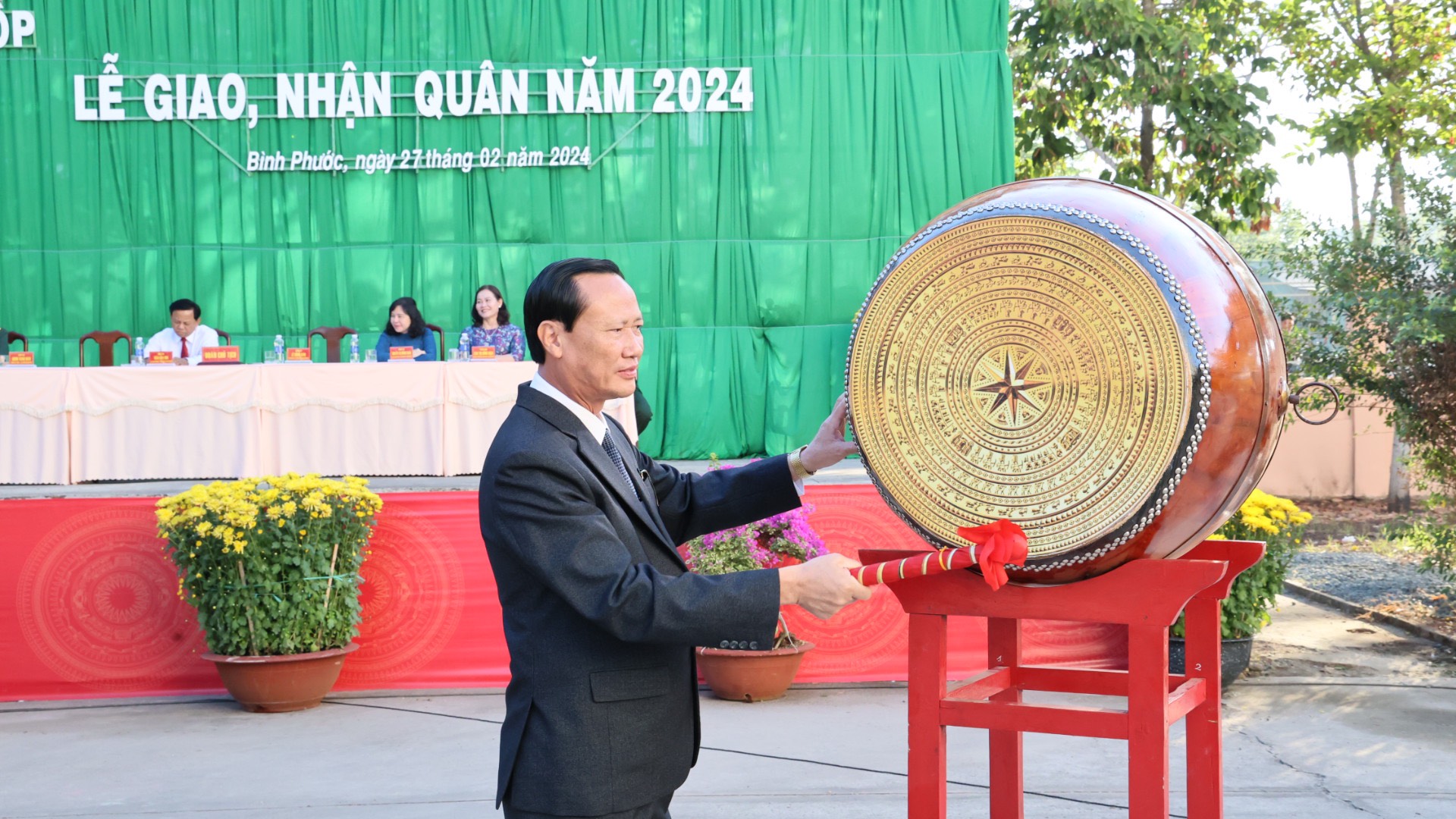 Chủ tịch UBND huyện, Chủ tịch HĐNVQS huyện Lê Quang Oanh vang lên hồi trống khai mạc lễ giao nhận quân năm 2024