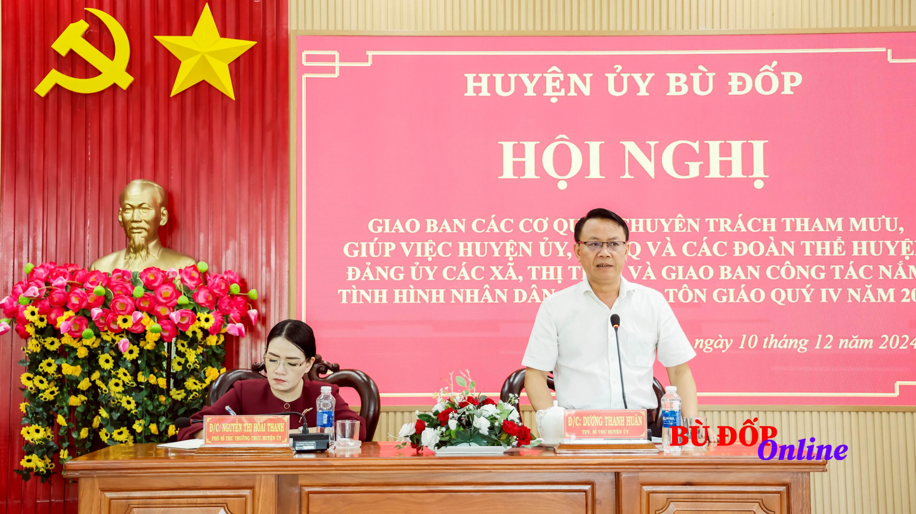 Sáng ngày 10/12, Huyện ủy Bù Đốp tổ chức hội nghị giao ban các cơ quan chuyên trách tham mưu, giúp việc Huyện ủy, Mặt trận Tổ quốc và các đoàn thể huyện, Đảng ủy các xã, thị trấn quý IV năm 2024. Tỉnh ủy viên, Bí thư Huyện ủy Dương Thanh Huân; Phó bí thư Thường trực Huyện uỷ Nguyễn Thị Hoài Thanh đồng chủ trì hội nghị.