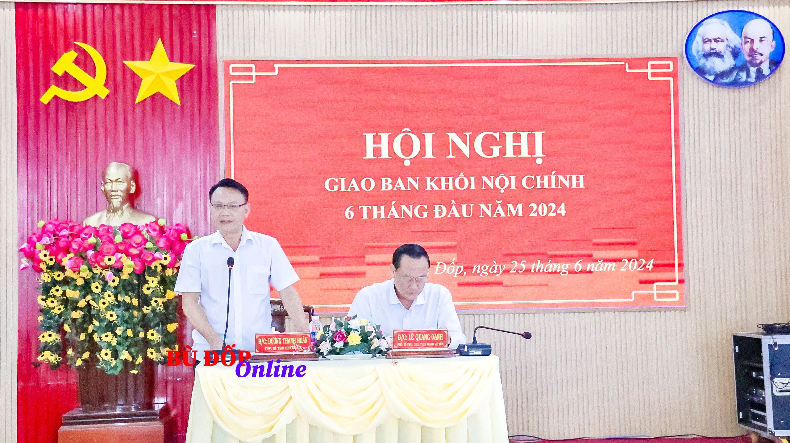 Chiều ngày 25-6, Huyện ủy Bù Đốp tổ chức hội nghị giao ban khối nội chính 6 tháng đầu năm, triển khai nhiệm vụ trọng tâm 6 tháng cuối năm 2024. Tỉnh ủy viên, Bí thư Huyện ủy Dương Thanh Huân; Phó bí thư, Chủ tịch UBND huyện Lê Quang Oanh đồng chủ trì hội nghị.