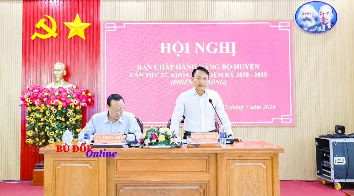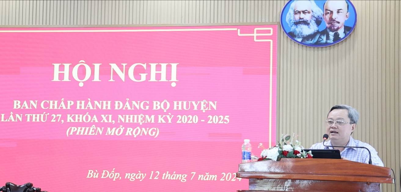 Sáng ngày 12-7, Huyện ủy Bù Đốp tổ chức hội nghị Ban chấp hành Đảng bộ huyện lần thứ 27, khóa XI, nhiệm kỳ 2020-2025 (phiên mở rộng). Hội nghị nhằm đánh giá tình hình thực hiện nghị quyết 6 tháng đầu năm và triển khai phương hướng nhiệm vụ 6 tháng cuối năm 2024.