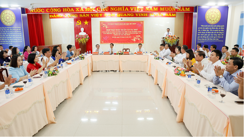 Sáng ngày 3-2, UBND huyện Bù Đốp tổ chức họp mặt các cơ quan, ban ngành, các đơn vị sự nghiệp công, các hội đặc thù, các đơn vị ngành dọc và UBND các xã, thị trấn nhân dịp đầu Xuân Ất Tỵ năm 2025. Chủ tịch UBND huyện Lê Quang Oanh; các đồng chí Phó chủ tịch HĐND - UBND huyện Nguyễn Hoành Sơn, Nguyễn Minh Phong và đồng chí Văn Công Danh chủ trì.
