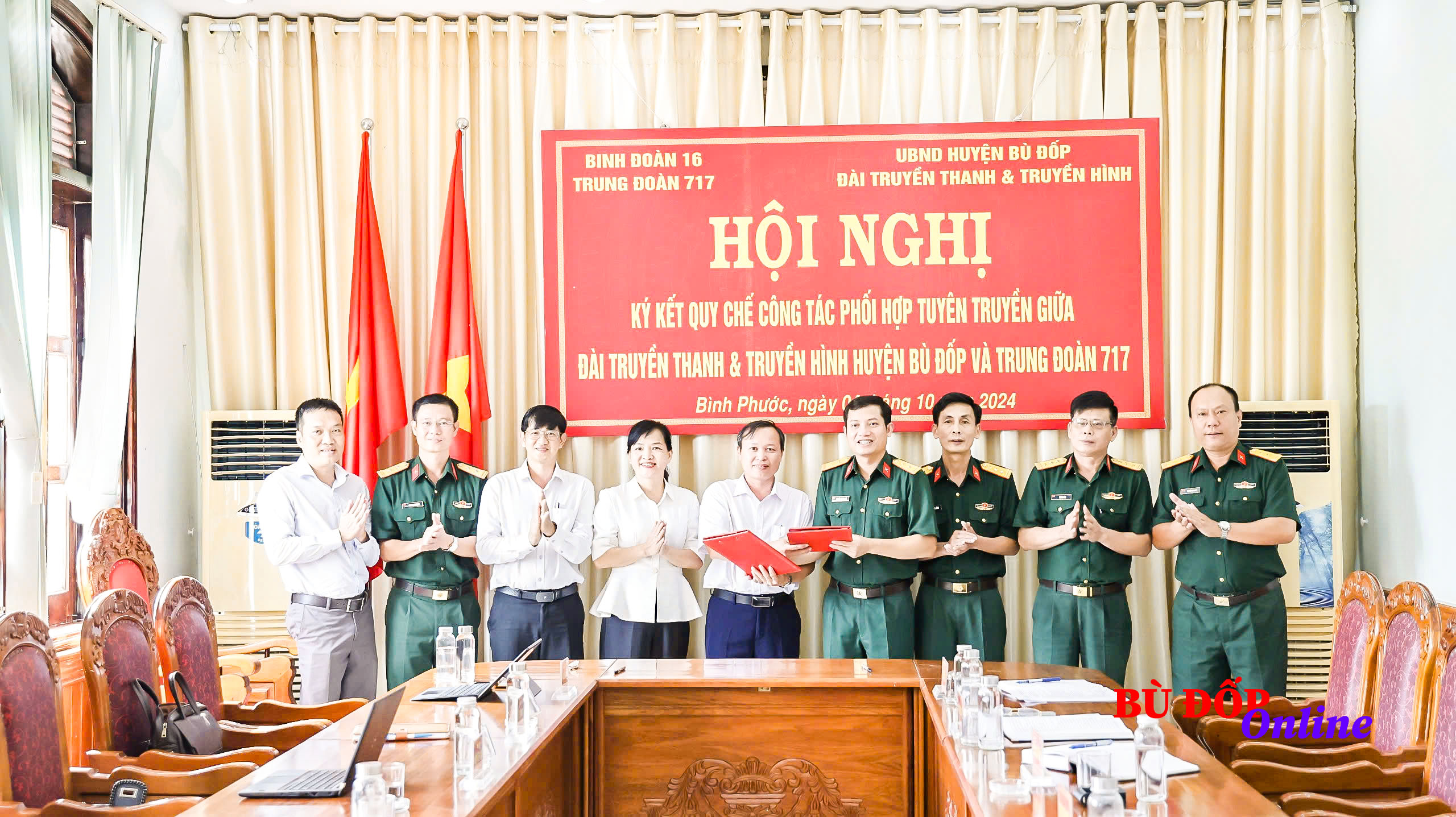 Chiều ngày 4-10, Đài Truyền thanh - Truyền hình huyện Bù Đốp và Trung đoàn 717 tổ chức hội nghị ký kết Quy chế phối hợp tuyên truyền nhiệm vụ Kinh tế - Quốc phòng. Dự hội nghị có Phó chủ tịch UBND huyện Văn Công Danh; Trưởng Ban Tuyên giáo Huyện ủy Văn Thị Ngọc Điệp; Trưởng đài Truyền thanh - Truyền hình Nguyễn Hùng Vương. Về phía Trung đoàn 717 có Trung tá Nguyễn Trung Đức - Chính ủy Trung đoàn 717; Thượng tá Hoàng Trung Đồng, Trung đoàn trưởng Trung đoàn 717; Thiếu tá Nguyễn Văn Luân – CNCT và đại diện lãnh đạo các đội sản xuất của Trung đoàn.