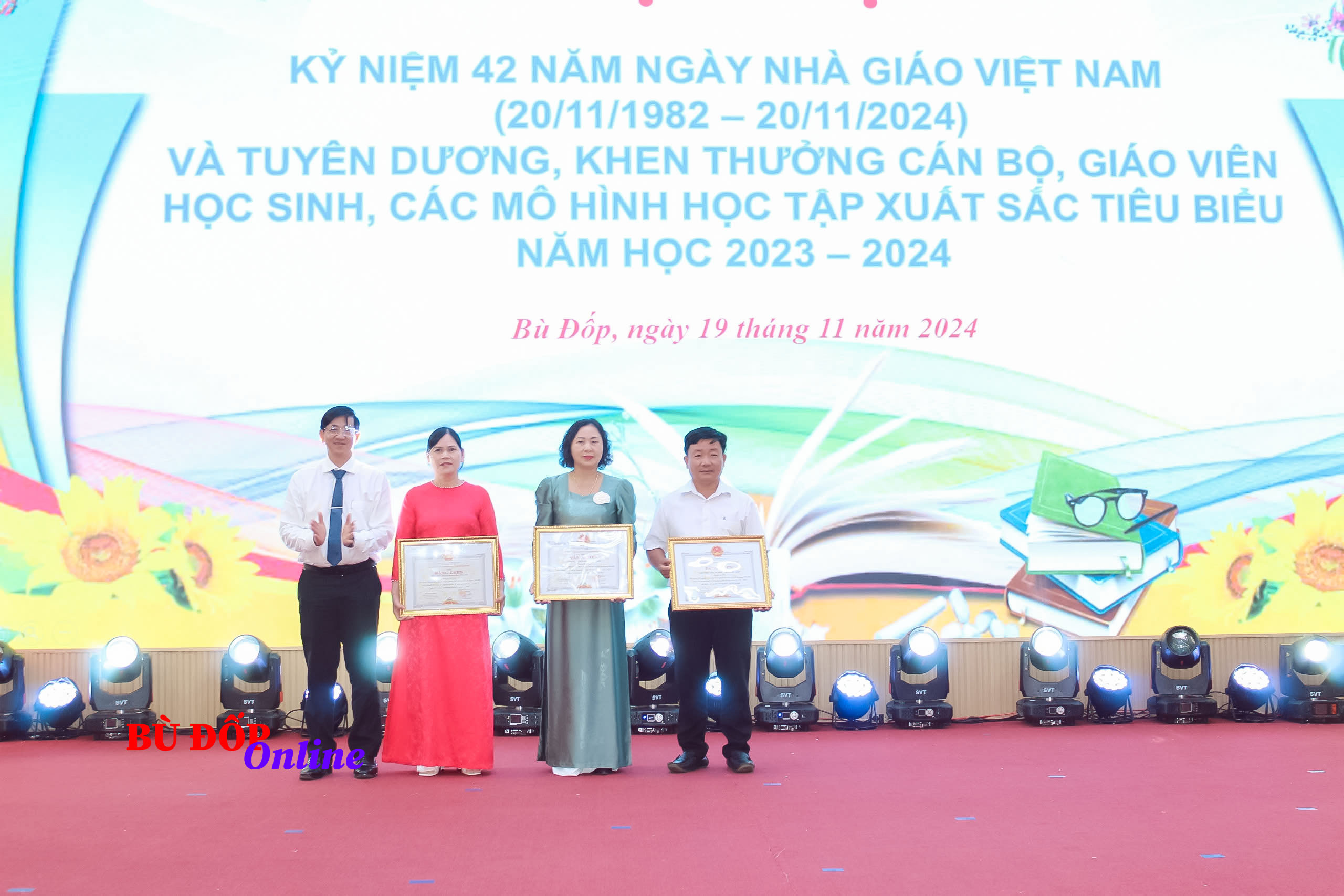Dịp này, Thủ Tướng Chính phủ tặng Bằng khen cho một cá nhân có thành tích trong công tác giáo dục từ năm học 2018-2019 đến năm học 2022-2023. UBND tỉnh Bình Phước tặng bằng khen cho 01 tập thể lao động xuất sắc và các cá nhân tập thể đạt giải cho các khối thi đua ngành giáo dục. UBND huyện, ngành giáo dục huyện tặng giấy khen cho các tập thể, cá nhân, cán bộ, giáo viên, học sinh và các mô hình học tập tiêu biểu xuất sắc trong năm học.