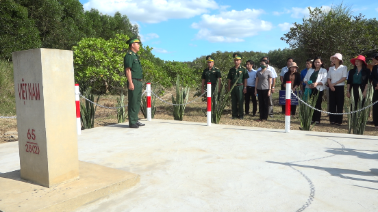 Cán bộ chiến sỹ đồn Biên phòng Thanh Hoà giới thiệu cho đoàn công tác về vị trí cắm mốc