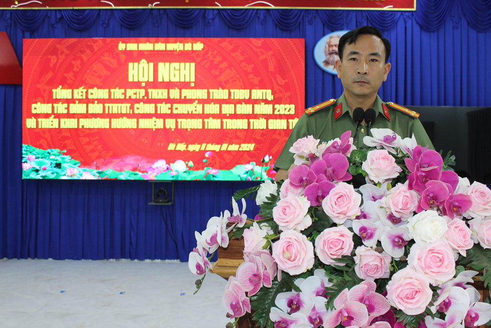 Phát biểu tại Hội nghị, Thượng tá Lê Tiến Huyên-Trưởng Công an huyện đã triển khai các nội dung trọng tâm trong công tác năm 2024 của ngành Công an; đặc biệt triển khai các nội dung kế hoạch mở đợt cao điểm tấn công trấn áp tội phạm, tệ nạn xã hội, trật tự an toàn giao thông trong dịp trước, trong và sau tết nguyên đán 2024 theo chỉ đạo của Huyện ủy, UBND huyện; đồng thời Thượng tá Lê Tiến Huyên-Trưởng Công an huyện rất mong các ngành, các địa phương phối hợp thực hiện tốt công tác đảm bảo an ninh trong dịp Tết nguyên đán Giáp Thìn năm 2024, giúp nhân dân đón xuân vui vẻ, ấm áp và an toàn.