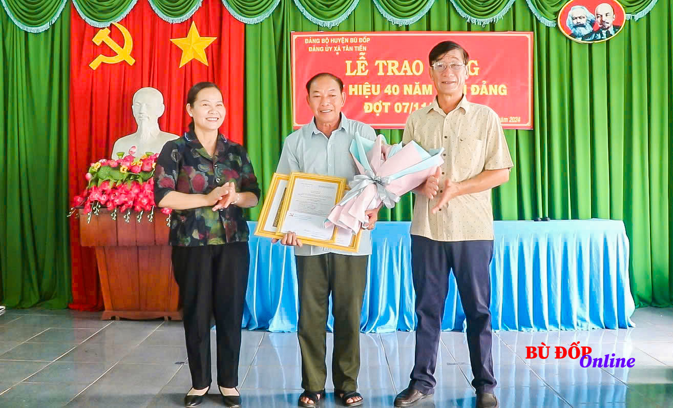 Sáng ngày 13/11/2024, Đảng ủy xã Tân Tiến, huyện Bù Đốp tổ chức Lễ trao tặng Huy hiệu 40 năm tuổi đảng cho đảng viên. Trưởng ban dân vận Huyện ủy Cao Thị Hồng Mận, các đồng chí trong Ban chấp hành Đảng ủy xã Tân Tiến dự chúc mừng.