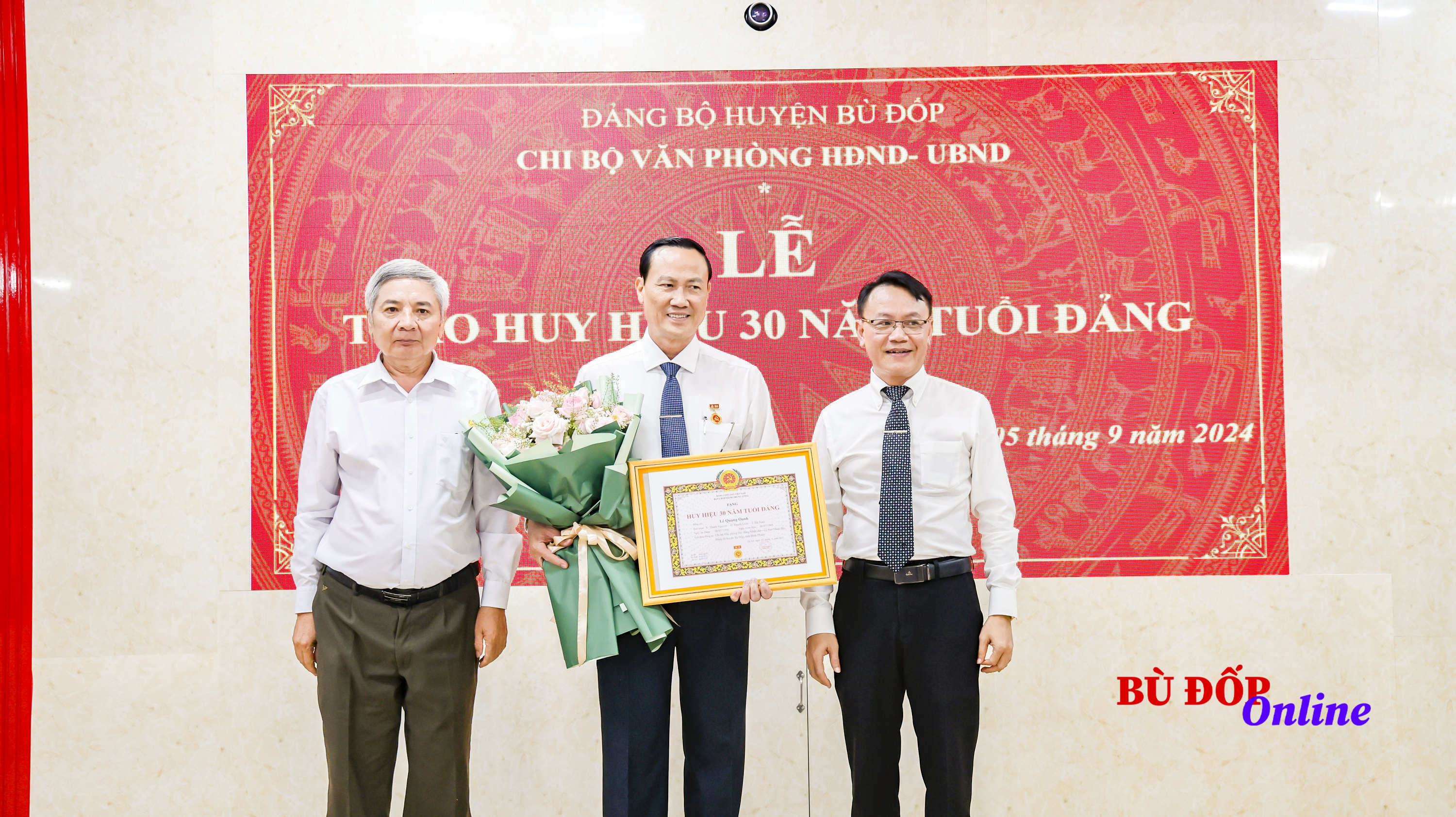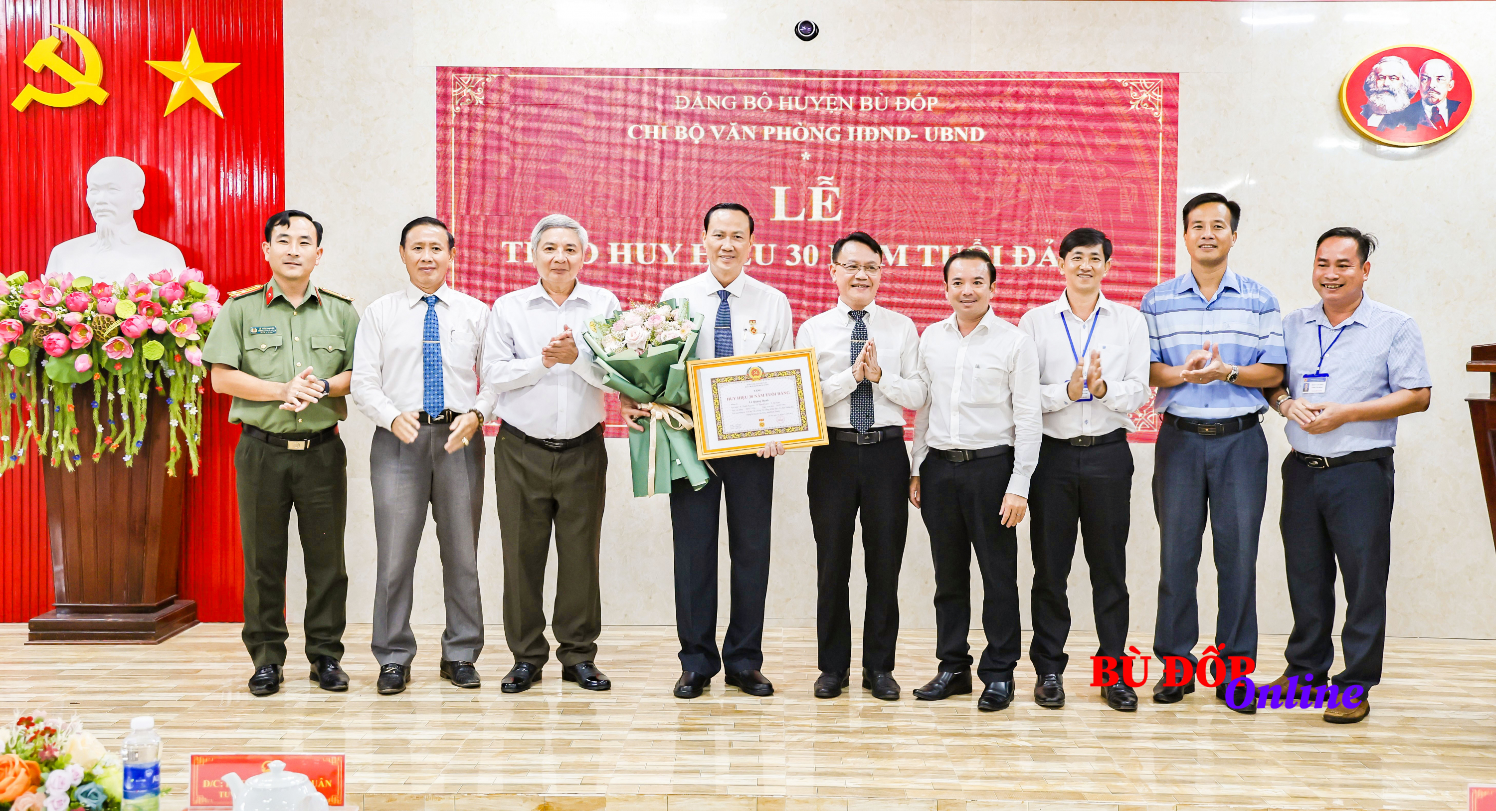 Chiều ngày 5-9, Chi bộ Văn phòng HĐND - UBND huyện Bù Đốp tổ chức Lễ trao tặng Huy hiệu 30 năm tuổi Đảng cho đồng chí Lê Quang Oanh, Phó Bí thư, Chủ tịch UBND huyện. Dự buổi lễ có Tỉnh ủy viên, Bí thư Huyện ủy Bù Đốp Dương Thanh Huân; các đồng chí Ủy viên Ban Thường vụ Huyện ủy; Thường trực HĐND, lãnh đạo UBND huyện; lãnh đạo Ban Tổ chức Huyện ủy; Văn phòng Huyện ủy, cùng toàn thể đảng viên trong chi bộ.
