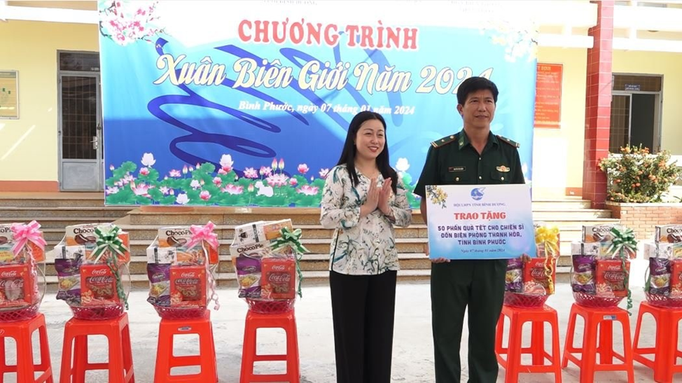(Hội Liên hiệp Phụ nữ Tỉnh Bình Dương trao bảng tượng trưng (50 phần quà tết) cho cán bộ chiến sỹ đồn Biên phòng Thanh Hòa)