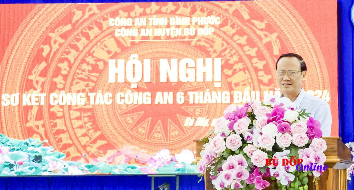 Phát biểu chỉ đạo tại hội nghị, Phó bí thư, Chủ tịch UBND huyện Lê Quang Oanh đánh giá cao công tác lãnh đạo, chỉ đạo trên các mặt hoạt động Công an huyện trong 6 tháng đầu năm, góp phần đảm bảo an ninh trật tự, an toàn xã hội trên địa bàn huyện cũng như tình hình an ninh trên tuyến biên giới. Chủ tịch UBND huyện cũng đề nghị Công an huyện tiếp tục tập trung làm tốt công tác đấu tranh phòng, chống tội phạm và tệ nạn xã hội; thực hiện tốt phong trào toàn dân bảo vệ ANTQ; tăng cường đảm bảo ANTT nội địa và trên tuyến biên giới; tiếp tục đẩy mạnh công tác xây dựng lực lượng Công an huyện Bù Đốp thật sự trong sạch, vững mạnh, chính quy, tinh nhuệ, hiện đại, đáp ứng yêu cầu, nhiệm vụ trong tình hình mới; phối hợp với các lực lượng thực hiện nhiệm vụ bảo vệ an ninh quốc gia, bảo đảm trật tự an toàn xã hội; giữ vững an ninh tuyến biên giới.