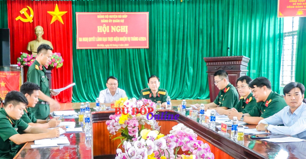 Vừa qua, chiều ngày 2/4/2024, Đảng uỷ Quân sự (ĐUQS) huyện Bù Đốp đã tổ chức Hội nghị giao ban công tác Đảng uỷ quý I/2024. Tham dự Hội nghị có Đại tá Nguyễn Thành Ruân Phó chính ủy Bộ chỉ huy quân sự tỉnh Bình Phước; Tỉnh uỷ viên, Bí thư Huyện uỷ, Chủ tịch HĐND huyện, Bí thư Đảng uỷ quân sự huyện Dương Thanh Huân; Trung tá Nguyễn Trường giang, Chỉ huy trưởng Ban chỉ huy quân sự huyện Bù Đốp đồng chủ trì Hội nghị.