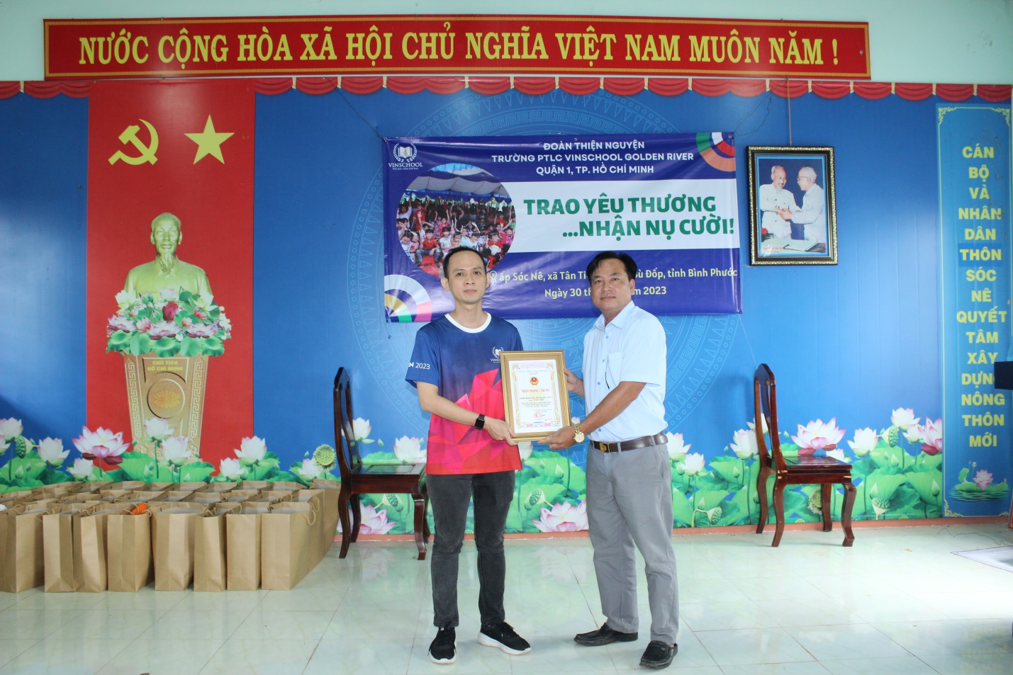 Được biết Bù Đốp (tỉnh Bình Phước) là huyện miền núi, biên giới có nhiều đồng bào dân tộc thiểu số sinh sống, trong đó tập trung đông nhất tại xã Tân Tiến, ngày 30/9/2023, Đoàn thiện nguyện trường Phổ thông liên cấp Vinschool Golden River, quận 1, thành phố Hồ Chí Minh đã phối hợp với UBND xã Tân Tiến gặp gỡ, trực tiếp trao 100 xuất quà cho học sinh và người dân vùng đồng bào dân tộc thiểu số tại xã Tân Tiến huyện Bù Đốp.