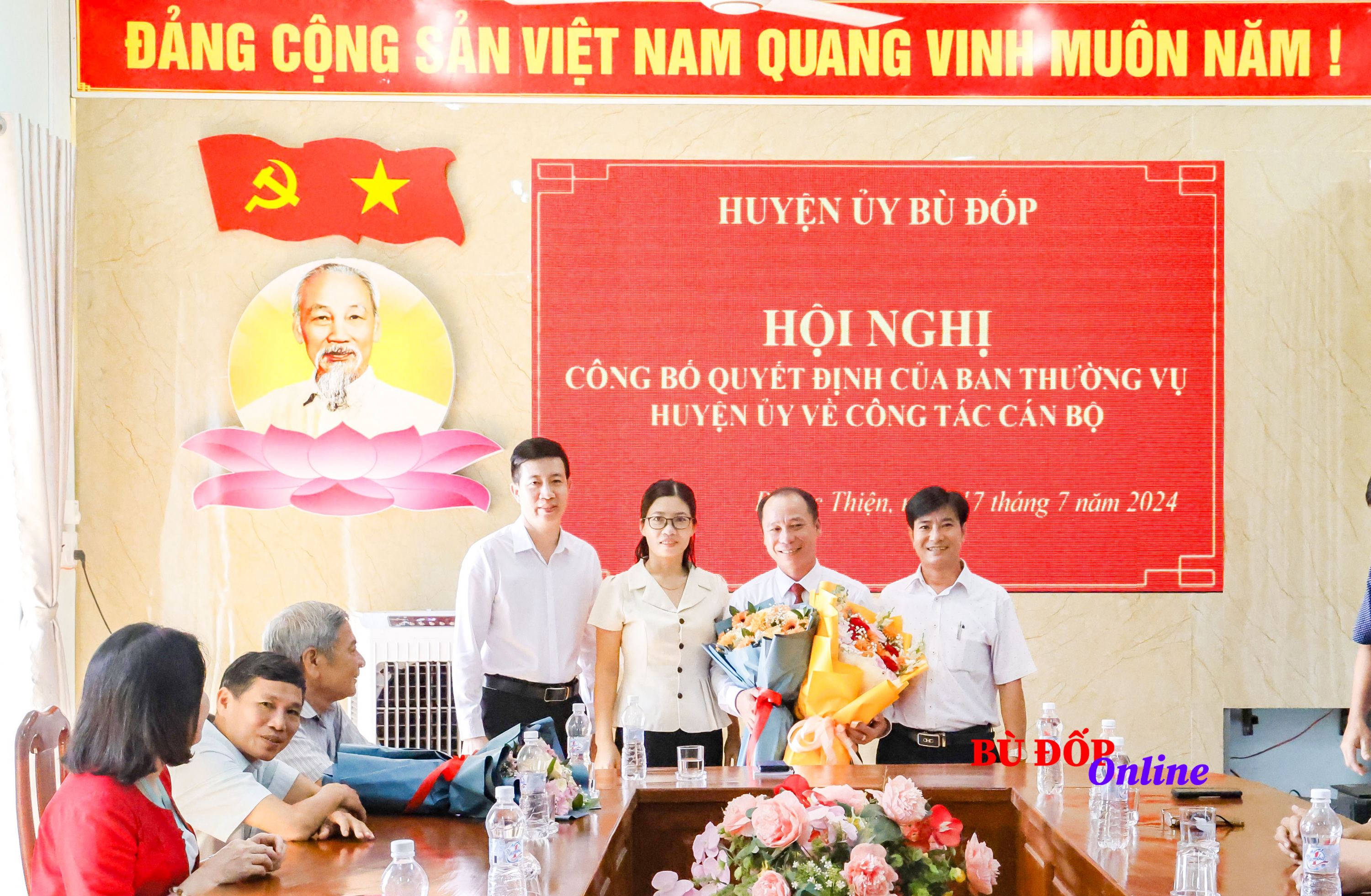 Trưởng Ban tổ chức Huyện ủy Chung Văn Hoan công bố quyết định của Ban thường vụ Huyện ủy Bù Đốp về việc chỉ định tham gia Ban chấp hành, Ban thường vụ và giữ chức vụ Bí thư Đảng ủy xã Phước Thiện, nhiệm kỳ 2020-2025 đối với đồng chí Nguyễn Quang Chí, HUV, Nguyên Chánh văn phòng Huyện ủy, từ ngày 17/7/2024.