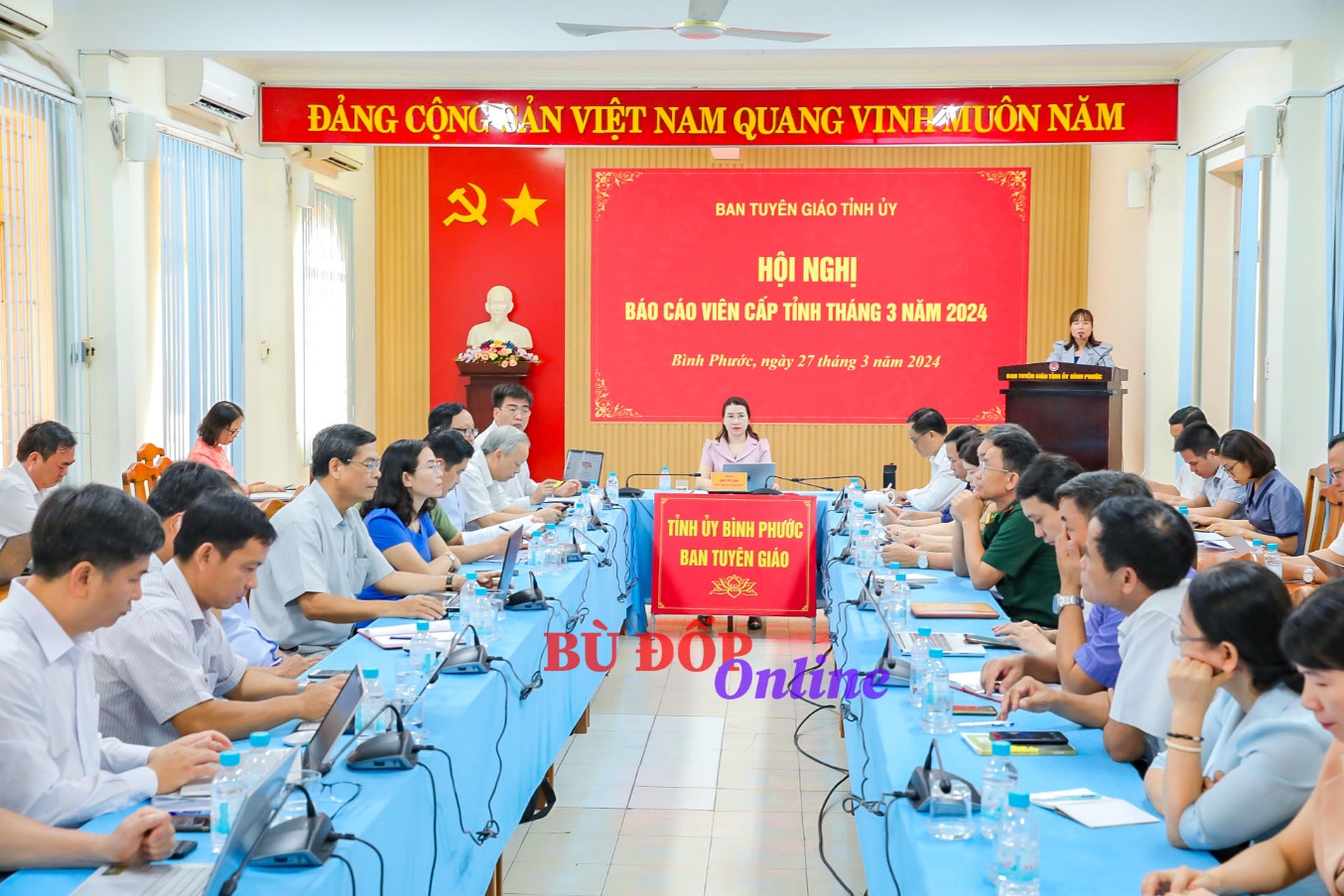 Sáng 27/3/2024, Ban Tuyên giáo Tỉnh ủy Bình Phước tổ chức Hội nghị Báo cáo viên định kỳ tháng 3/2024. Tỉnh ủy viên, Phó Trưởng Ban tuyên giáo Tỉnh ủy Đào Thị Lanh chủ trì hội nghị. Hội nghị được trực tuyến đến các huyện, thị, thành ủy, đảng ủy trực thuộc Tỉnh ủy và các điểm cầu xã, phường, thị trấn trong tỉnh với trên 1.940 đại biểu tham dự.