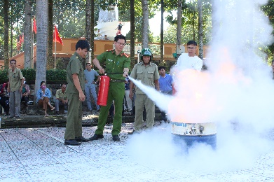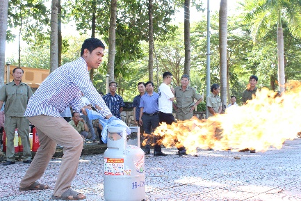 ( Học viên được cán bộ chuyên môn hướng dẫn cách sử dụng và thao tác dập lửa bằng bình cứu hoả tại chỗ)