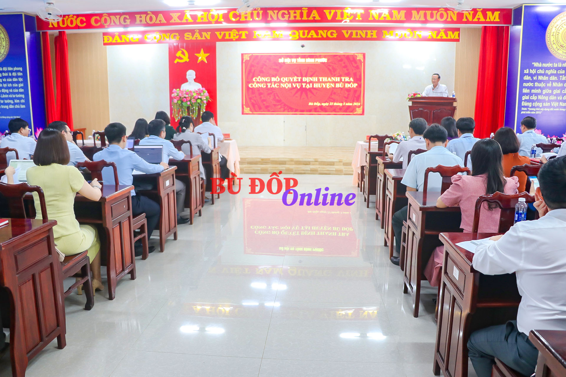 Tại hội nghị, Chánh Thanh tra Sở Nội vụ, trưởng đoàn 15 Đinh Thị Thu Hương đã công bố quyết định số 15/QĐ-T.Tr của Chánh Thanh tra Sở Nội vụ về công tác nội vụ tại huyện Bù Đốp và các cơ quan, đơn vị trực thuộc. Theo đó, thời gian thanh tra thực tế tại huyện Bù Đốp là 20 ngày. Nội dung thanh tra về tổ chức bộ máy và công tác quản lý sử dụng biên chế công chức, viên chức và hợp đồng lao động; quản lý cán bộ, công chức và những người hoạt động không chuyên trách ở cấp xã; thanh tra công tác quy hoạc, bổ nhiêm, bổ nhiệm lại công chức, viên chức giữ chức vụ lãnh đạo, quản lý; thanh tra việc điều động, luân chuyển, biệt phái đối với công chức, viên chức; thanh tra việc chuyển đổi vị trí công tác đối với công chức, viên chức; thanh tra công tác thi đua khen thưởng; thanh tra công tác tôn giáo.