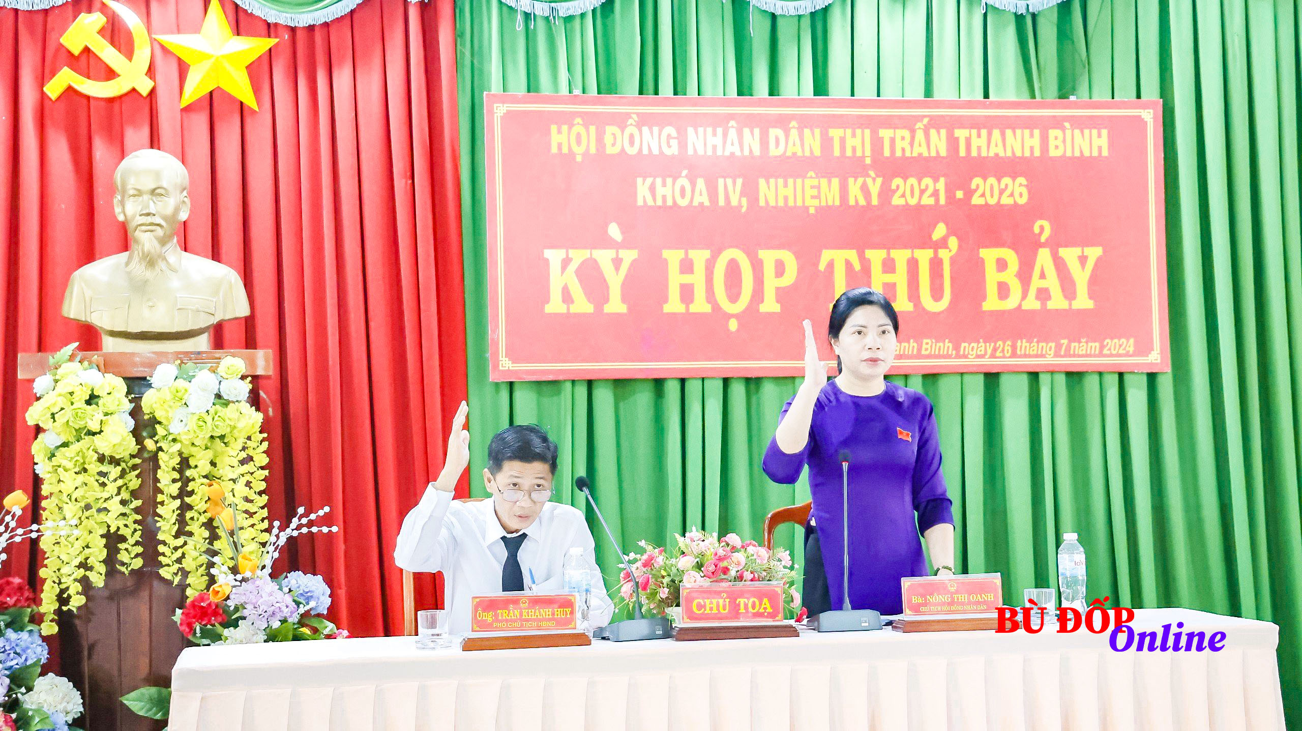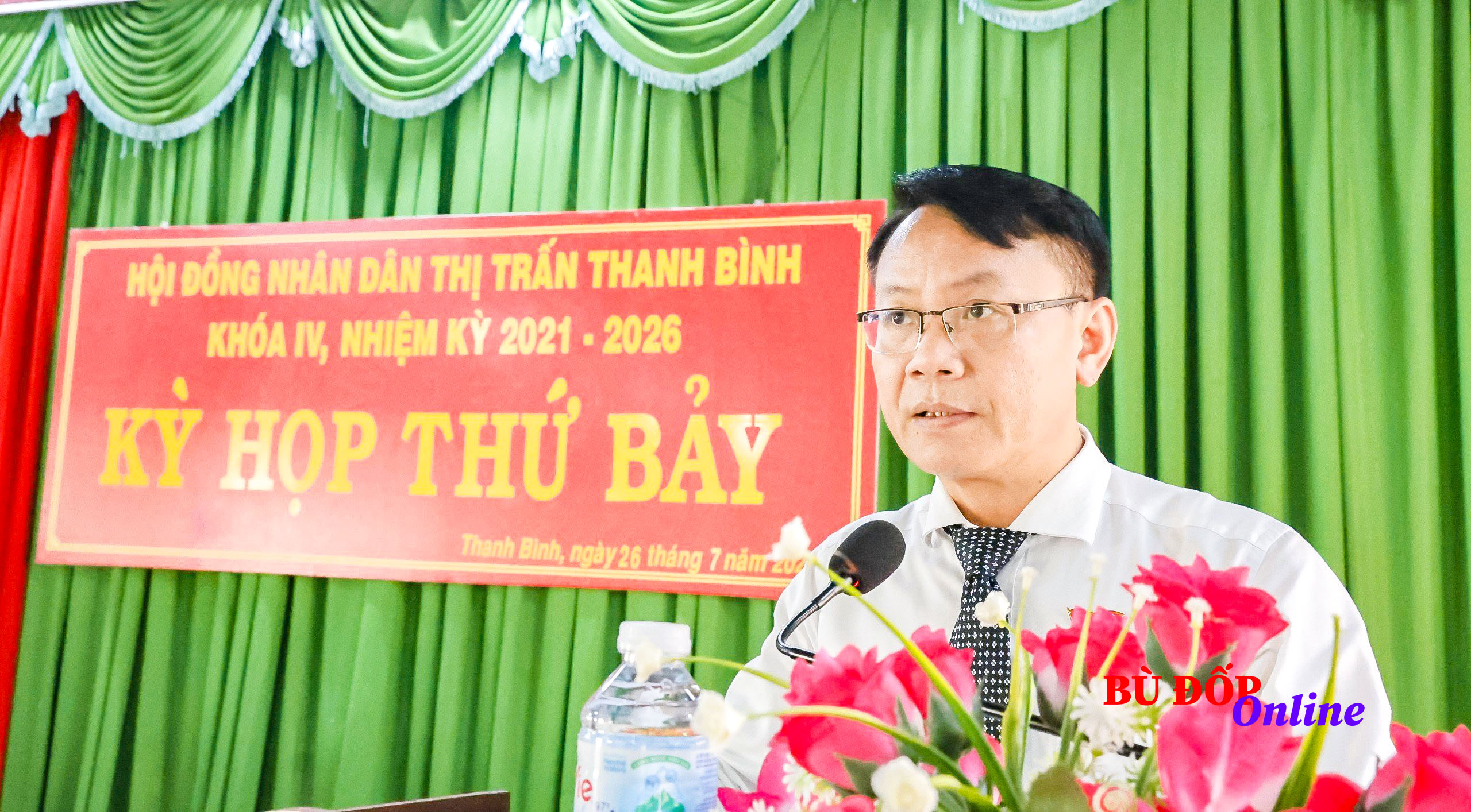 Sáng ngày 26-7, HĐND thị trấn Thanh Bình tổ chức kỳ họp lần thứ 7 khóa IV, nhiệm kỳ 2021-2026. Kỳ họp nhằm đánh giá kết quả thực hiện nhiệm vụ kinh tế - xã hội 6 tháng đầu năm, thống nhất đề ra nhiệm vụ trọng tâm 6 tháng cuối năm 2024. Dự kỳ họp có Tỉnh ủy viên, Bí thư Huyện ủy, Chủ tịch HĐND huyện Bù Đốp Dương Thanh Huân; HUV, Bí thư Đảng ủy thị trấn Thanh Bình Phạm Văn Thắng và các đại biểu HĐND thị trấn Thanh Bình cùng dự.