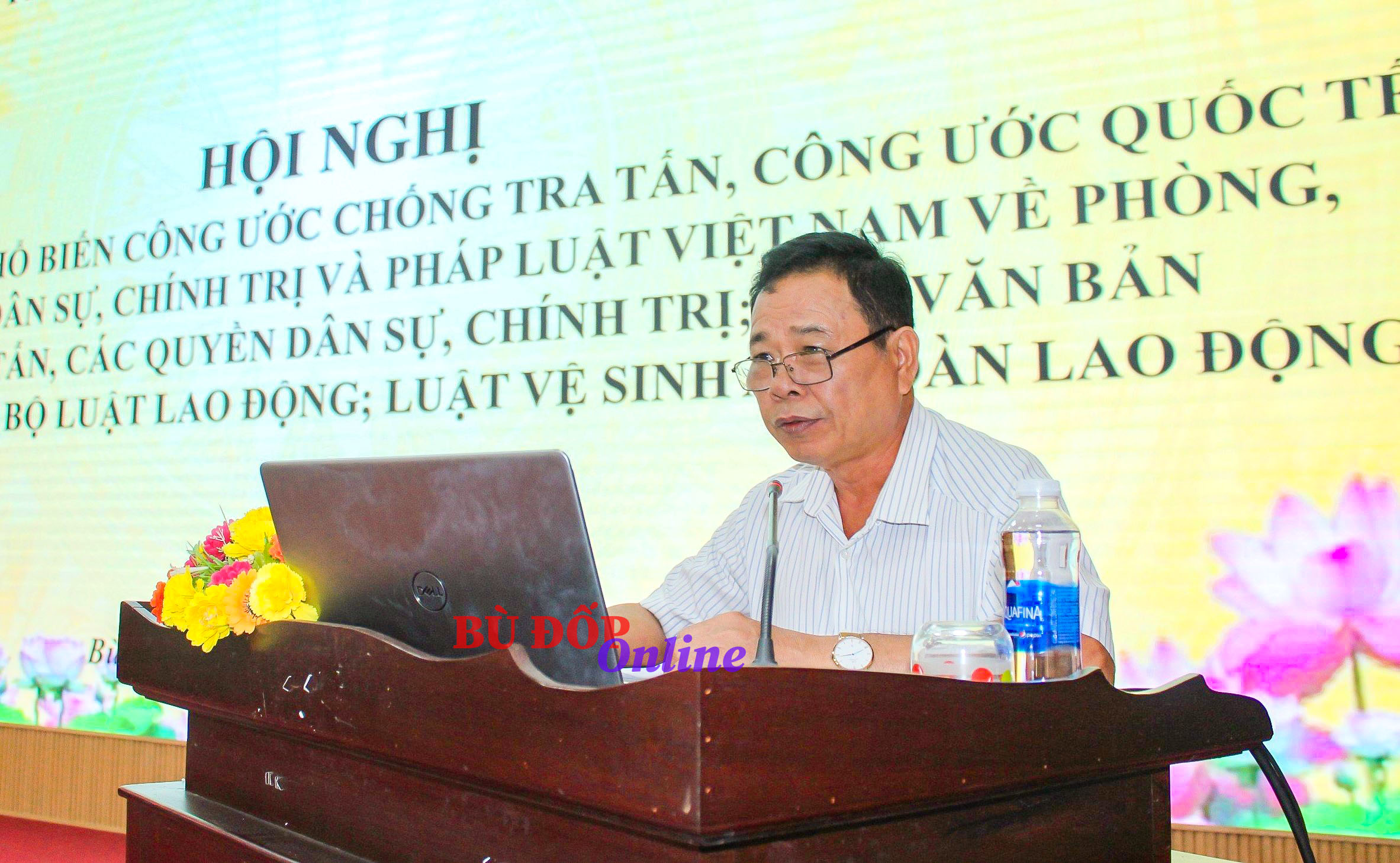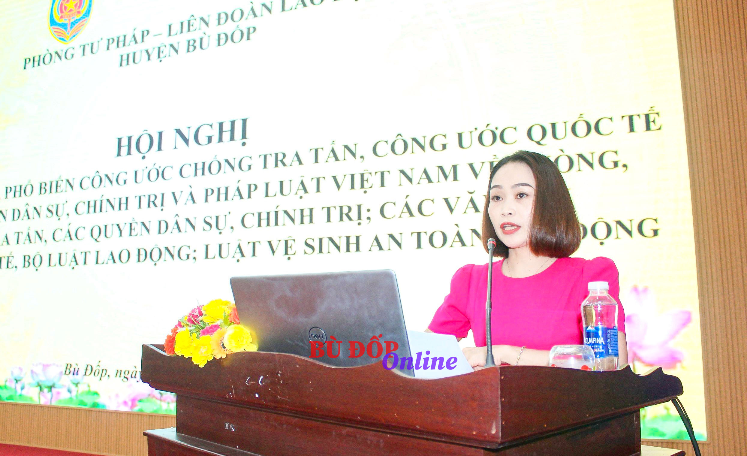 Sáng ngày 14-5, Phòng tư pháp phối hợp Liên đoàn lao động huyện Bù Đốp tổ chức Hội nghị tuyên truyền phổ biến Công ước chống tra tấn và pháp luật Việt Nam về phòng, chống tra tấn; Công ước quốc tế về các quyền dân sự, chính trị và pháp luật Việt Nam về quyền dân sự, chính trị; các văn bản quy định về Bảo hiểm y tế, Bộ luật lao động, luật an toàn vệ sinh lao động. Dự hội nghị có trên 200 cán bộ, công chức, viên chức, người lao động là công đoàn viên các công đoàn cơ sở trên địa bàn huyện