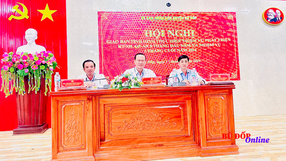Chiều ngày 17-9, UBND huyện Bù Đốp tổ chức Hội nghị giao ban tình hình thực hiện nhiệm vụ phát triển Kinh tế - Xã hội, Quốc phòng-An ninh 9 tháng đầu năm và nhiệm vụ 3 tháng cuối năm 2024. Phó bí thư, Chủ tịch UBND huyện Lê Quang Oanh; Phó chủ tịch UBND huyện Nguyễn Minh Phong và Phó chủ tịch UBND huyện Văn Công Danh đồng chủ trì Hội nghị.