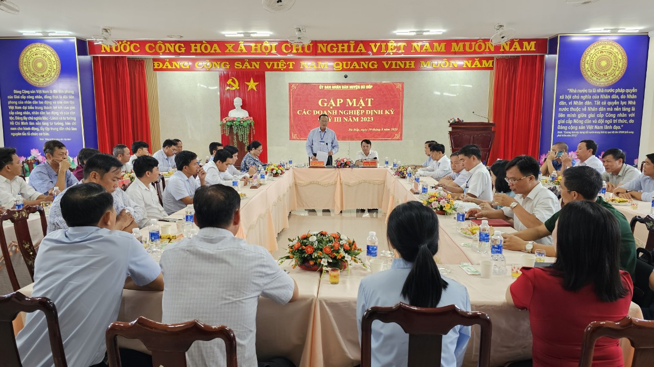 Tại buổi gặp mặt, UBND huyện Bù Đốp đã thông tin tình hình kinh tế-xã hội, quốc phòng, an ninh 7 tháng đầu năm 2023; các chủ trương, chính sách mới đối với Doanh nghiệp. Theo đó, 7 tháng đầu năm 2023, mặc dù còn gặp nhiều khó khăn, song với sự nỗ lực của chính quyền và sự đồng lòng của nhân dân cùng các Doanh nghiệp, các chỉ tiêu kinh tế-xã hội tiếp tục phát triển, cụ thể như: Tổng diện tích cây trồng 22.488 ha, đạt 95,28% so với Kế hoạch; có 6/6 xã đạt chuẩn nông thôn mới và có thị trấn Thanh Bình đạt chuẩn đô thị văn minh; Giá trị sản xuất công nghiệp – tiểu thủ công nghiệp ngoài quốc doanh đạt 332,4 tỷ đồng, đạt 52% so với Nghị quyết của HĐND huyện, tăng 3,65% so với cùng kỳ năm 2022; Giá trị trao đổi hàng hóa – dịch vụ đạt 1.292 tỷ đồng, đạt 54% Nghị quyết của HĐND huyện tăng 5,21% so với cùng kỳ; Tổng thu ngân sách địa phương: 351.409 triệu đồng, đạt 55% so với Quyết định tỉnh giao và đạt 46% so với Nghị quyết huyện thông qua. Trong đó: Tổng thu ngân sách trên địa bàn huyện: 91.805 triệu đồng, đạt 43% so với Quyết định tỉnh giao và đạt 36% so với Nghị quyết huyện giao; Giải ngân vốn đầu tư xây dựng cơ bản tỉnh hỗ trợ: 68 tỷ 582 triệu đồng, đạt 80,2% kế hoạch. Lĩnh vực văn hóa-xã hội, Công tác chính sách và an sinh xã hội được quan tâm thực hiện tốt, trong đó đã hoàn thành Chương trình giáo dục năm học 2022-2023 và chuẩn bị các điều kiện khai giảng năm học 2023-2024; Xây dựng và triển khai các dự án, chương trình giảm nghèo trên địa bàn huyện phấn đấu đến cuối năm 2023 giảm 272 hộ nghèo (trong đó có 58 hộ nghèo là đồng bào DTTS); quốc phòng-an ninh được giữ vững; trật tự an toàn xã hội được đảm bảo; Tổ chức giao nhận quân năm 2023 với tổng số 121 thanh niên nhập ngũ, đạt 100% chỉ tiêu tỉnh giao; Việc giải quyết thủ tục hành chính tại Trung tâm phục vụ hành chính công và bộ phận một cửa được thực hiện nhanh chóng, đúng quy định; không để hồ sơ trễ hạn.