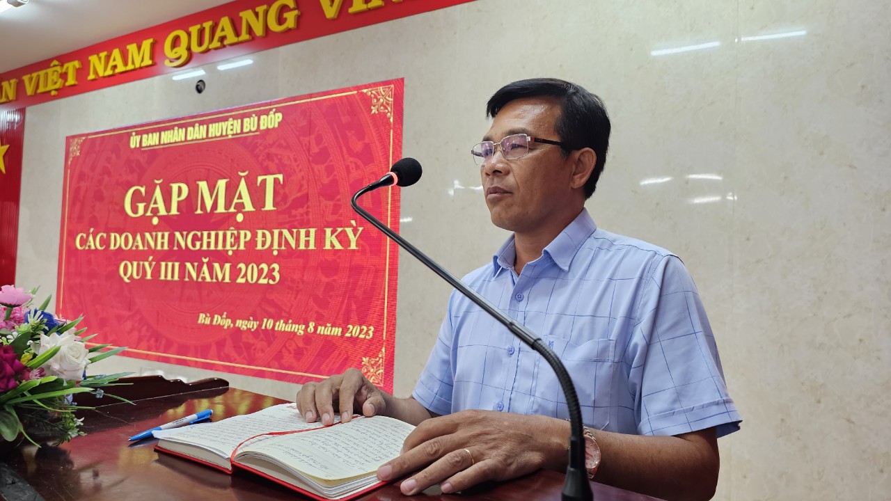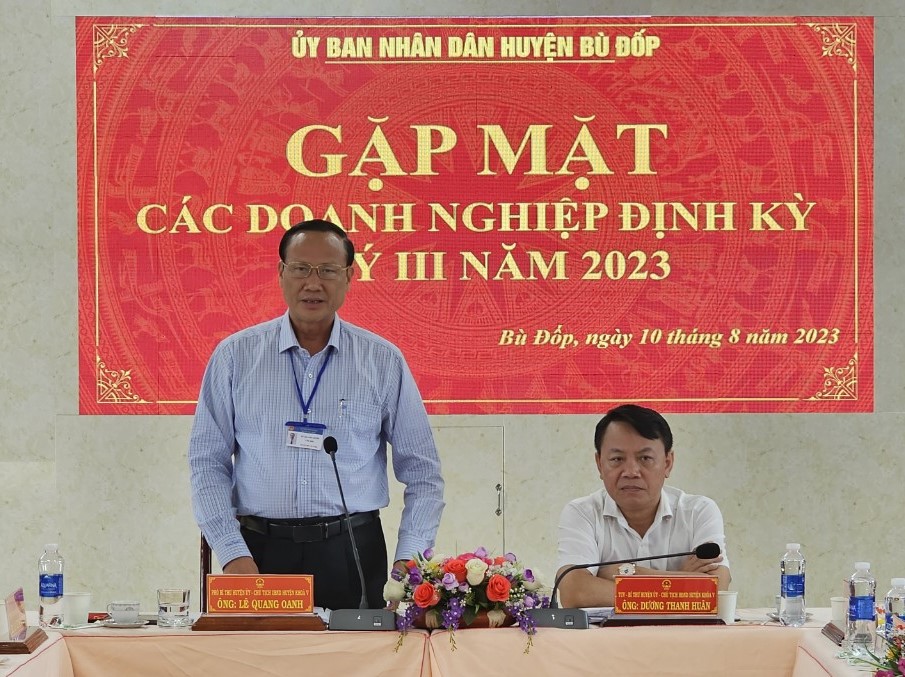 Sáng ngày 10/8/2023, Đồng chí Lê Quang Oanh-Phó Bí thư, Chủ tịch UBND huyện Bù Đốp chủ trì tổ chức gặp mặt các doanh nghiệp định kỳ quý III năm 2023. Tham dự Hội nghị có đồng chí Dương Thanh Huân-TUV,Bí thư Huyện ủy; Đ/c Cao Thị Hồng Mận-UVBTV Huyện ủy-Chủ tịch Ủy ban MTTQVN huyện; ông Nguyễn Hoành Sơn-Phó Chủ tịch HĐND huyện; các đồng chí ủy viên UBND huyện; các ngành chức năng huyện và Chủ tịch UBND các xã, thị trấn; 38 Doanh nghiệp và các Hợp tác xã trên địa bàn huyện.