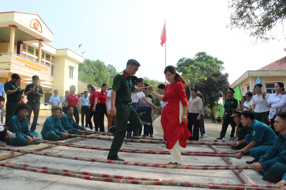 (Cán bộ chiến sỹ Đồn Biên phòng tham gia điệu múa nhảy sạp gắn kết tình quân nhân nơi biên giới)