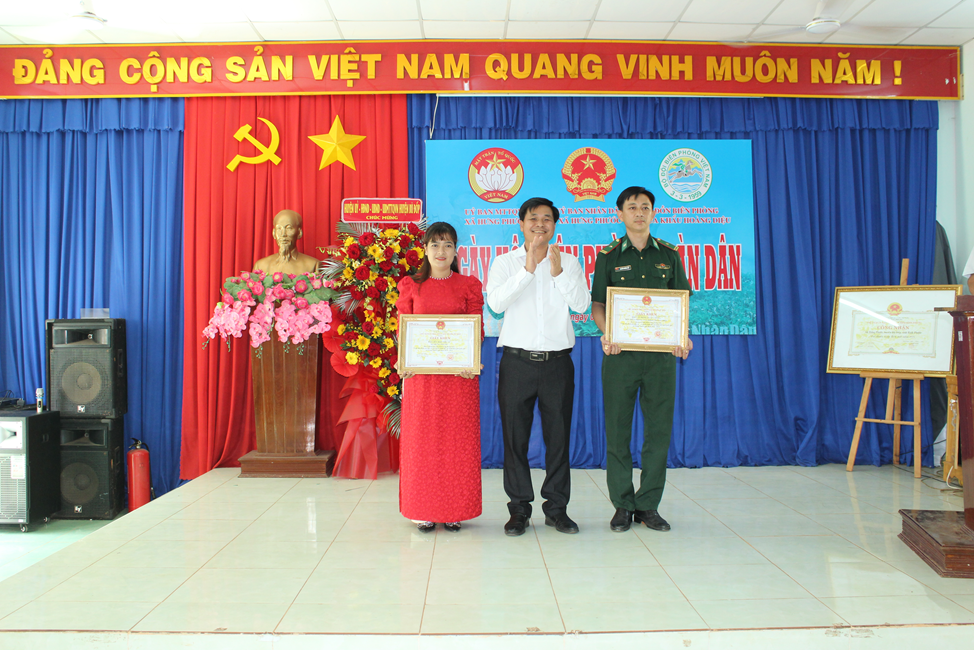 (Chủ tịch UBND xã Hưng Phước tặng giấy khen cho 4 cá nhân có nhiều thành tích trong thực hiện “Ngày biên phòng toàn dân” năm 2023).