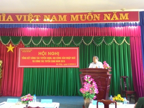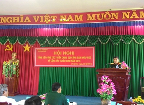 Công tác tuyển chọn công dân nhập ngũ là một trong những nhiệm vụ trọng tâm mà Đảng, Nhà nước đặc biệt chú trọng và duy trì hàng năm, nhằm tuyển chọn những thanh niên đủ điều kiện, khoẻ mạnh lên đường nhập ngũ, thực hiện nghĩa vụ quân sự của một công dân, góp phần bảo vệ vững chắc tổ quốc Việt Nam XHCN. Năm 2015, huyện Bù Đốp đã chỉ đạo các cấp, các ngành triển khai thực hiện và hoàn thành tốt nhiệm vụ tuyển chọn, gọi công dân nhập ngũ theo chỉ tiêu tỉnh giao, cụ thể đã tổ chức tuyên truyền luật nghĩa vụ quân sự với 9748 người tham dự, các khâu đăng ký, quản lý nguồn cũng được thực hiện chặt chẽ, tổng số nguồn trong độ tuổi từ 17-25 của huyện là 2.427 thanh niên, đã đăng ký đạt 100%. Qua xét duyệt, huyện Bù Đốp đã chọn được 80 thanh niên đủ điều kiện để lên đường nhập ngũ, đạt 100% chỉ tiêu tỉnh giao (trong đó có 02 đảng viên và 78 đoàn viên). Trình độ học vấn: Đại học có 01 thanh niên, cao đẳng có 02 thanh niên, trung cấp có 01 thanh niên; số thanh niên còn lại có trình độ học vấn từ lớp 7 đến lớp 12.