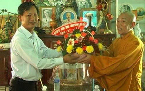 | Ông Đoàn Văn Thảo phó bí thư – chủ tịch HĐND huyện chúc mừng chức sắc chùa Thanh Minh, xã Tân Thành |