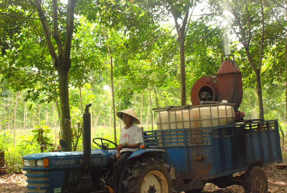Ông Cúc cho biết, nước thuốc được bơm ra với áp lực rất mạnh sẽ bay tới tán lá của cây và bám dính vào đó để diệt trừ nấm bệnh gây hại. Bộ phận “máy phun thuốc” gồm: bồn nhựa chứa nước thuốc (1000 lít nước) và một người điều khiển chiếc chiếc máy kéo (máy cày), chạy đi theo từng hàng trong vườn cây cao su để phun thuốc. Làm cách này thuốc có khả năng bay rất cao lên tới tận ngọn cây cao su, nên hiệu quả phòng trừ bệnh rất cao. Với chiếc máy này mỗi ngày có thể phun từ 15 - 20ha/người, người phun thuốc cũng không bị thuốc rớt lên ảnh hưởng đến sức khỏe như cách phun cầm sào đưa lên cao. Ngoài bệnh rụng lá, máy phun thuốc tự chế này còn có thể dùng để phun thuốc phòng trị rất nhiều loại sâu bệnh hại trên bộ lá của cây cao su như bệnh phấn trắng, bệnh héo đen đầu lá, bệnh nấm hồng… thường gây hại rất phổ biến trên cây cao su hiện nay ở nước ta.