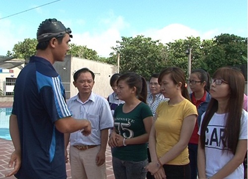 | Các học viên được nghe kỹ thuật viên trình bày cách bơi, kỹ thuật cứu đuối |