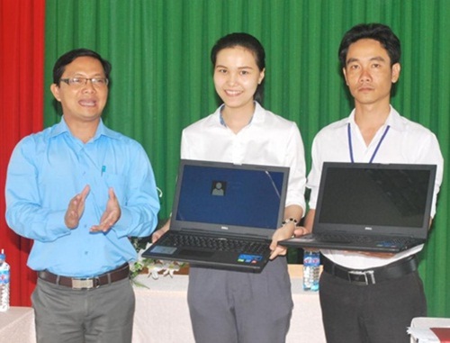 | Bí thư Huyện ủy trao tặng laptop cho 2 phóng viên đài. |