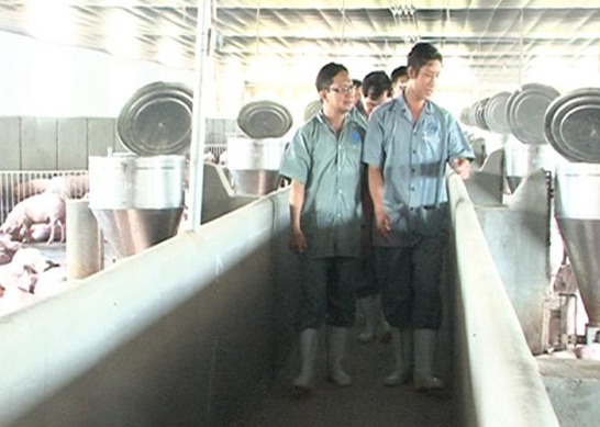 | Cán bộ kỹ thuật trại nuôi heo giới thiệu quy trình nuôi heo khép kín với đoàn lãnh đạo huyện Bù Đốp. |