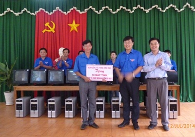 | Đ/c Lê Quốc Phong (giữa) – Bí thư Trung ương Đoàn, chủ tịch Hội Sinh viên Việt Nam tặng máy tính cho Đoàn thanh niên huyện Bù Đốp |