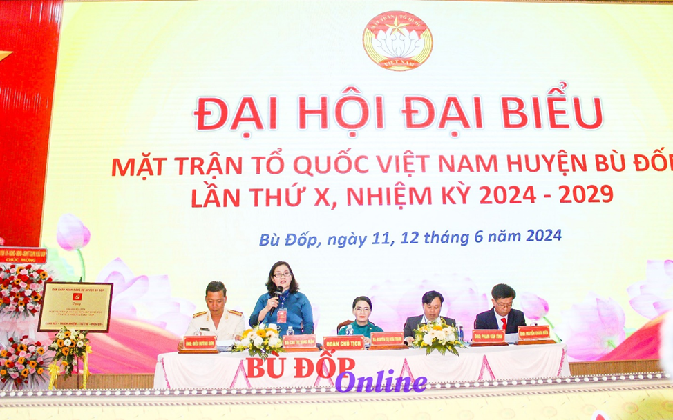 Sáng mai, ngày 12/6, Đại hội Đại biểu MTTQ Việt Nam huyện Bù Đốp tiếp tục ngày làm việc thứ 2: Hiệp thương cử Ủy ban MTTQ Việt Nam huyện Bù Đốp lần thứ X, nhiệm kỳ 2024 - 2029; hiệp thương cử Đoàn đại biểu dự Đại hội Đại biểu MTTQ Việt Nam tỉnh lần thứ X, nhiệm kỳ 2024 - 2029; khen thưởng các tập thể, cá nhân có thành tích trong công tác Mặt trận nhiệm kỳ 2019 – 2024…