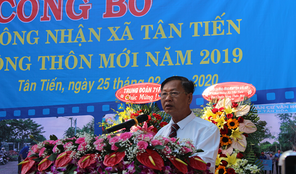 Phát biểu tại buổi Lễ, đồng chí Đoàn Văn Thảo – Chủ tịch UBND huyện Bù Đốp chúc mừng và biểu dương sự đoàn kết, nỗ lực của Đảng bộ, chính quyền và nhân dân xã Tân Tiến đã hoàn thành xuất sắc nhiệm vụ xây dựng nông thôn mới. Trong thời gian tới đề nghị Đảng bộ, chính quyền và nhân dân huyện Bù Đốp nói chung, xã Tân Tiến nói riêng tiếp tục thực hiện hiệu quả các chủ trương của Đảng, chính sách, pháp luật của Nhà nước về phát triển kinh tế - xã hội; quan tâm tới sản xuất và đời sống của nhân dân; đẩy mạnh phong trào “Toàn dân đoàn kết xây dựng nông thôn mới và đô thị văn minh”, phong trào “Toàn dân bảo vệ an ninh Tổ quốc”; năm 2020 phấn đấu đưa xã Thanh Hòa về đích nông thôn mới…