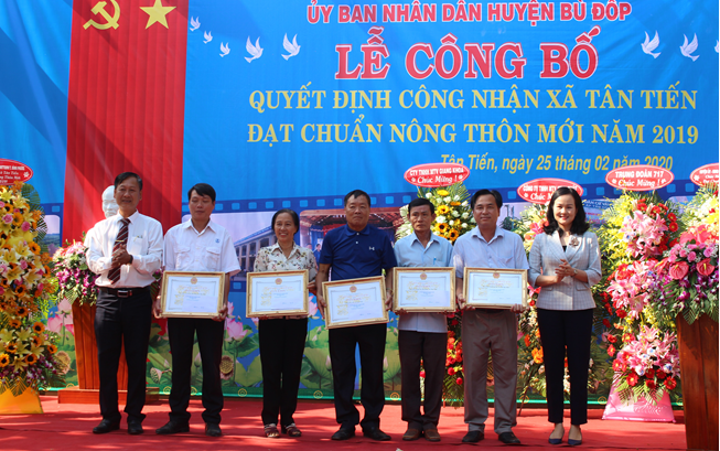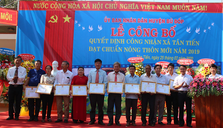 Dịp này, UBND tỉnh tặng 05 bằng khen cho 02 tập thể, 03 cá nhân; UBND huyện tặng 16 giấy khen cho 05 tập thể và 11 cá nhân có thành tích xuất sắc trong xây dựng xã Tân Tiến đạt chuẩn nông thôn mới.