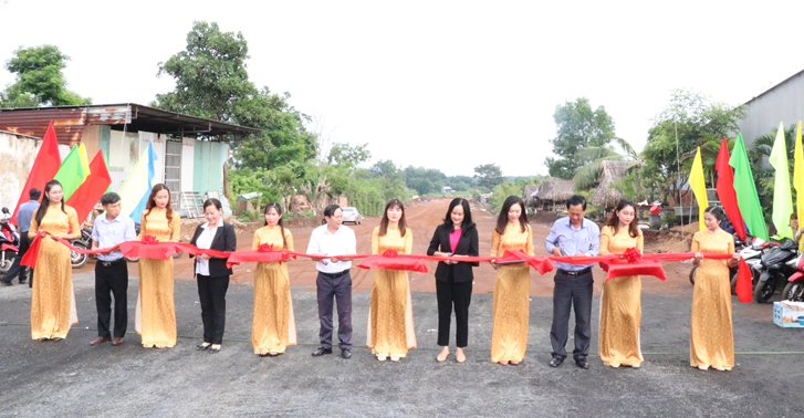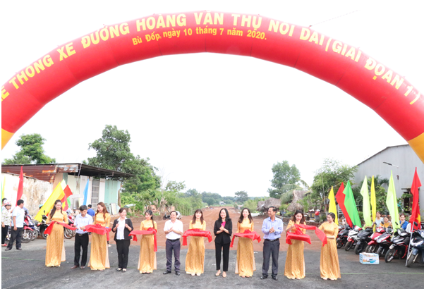 Lãnh đạo huyện Bù Đốp và đồng chí bí thư Thị trấn Thanh Bình cắt băng khánh thành tuyến đường Hoàng Văn thụ nối dài.