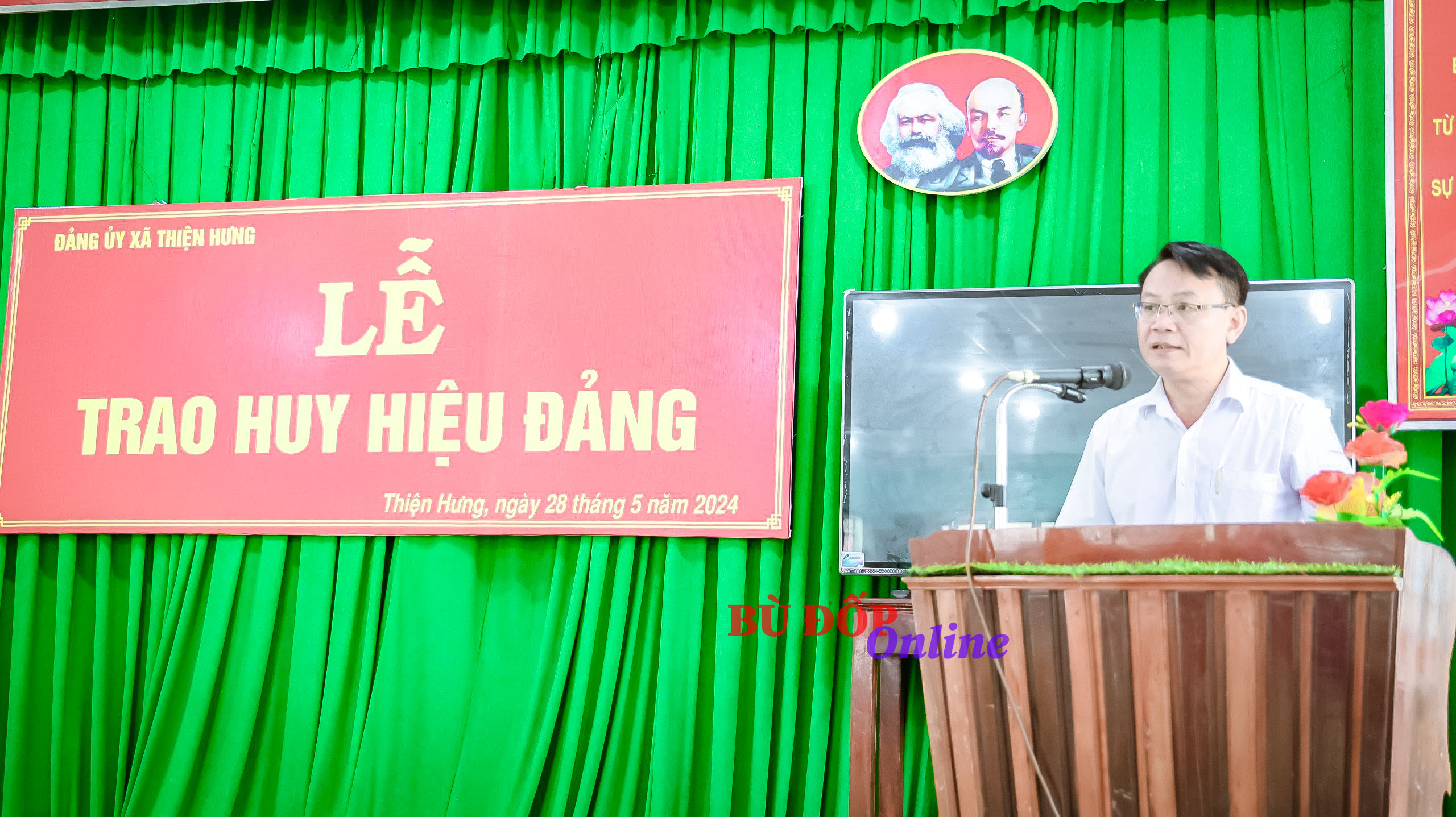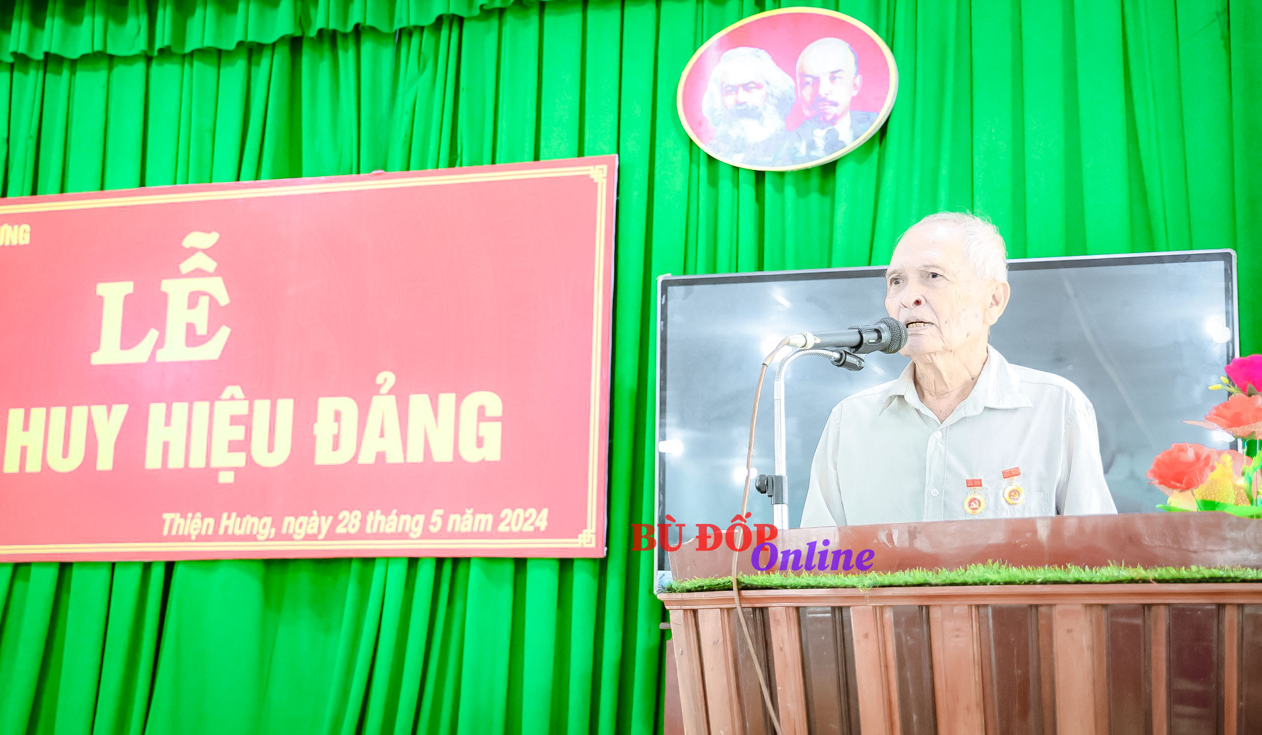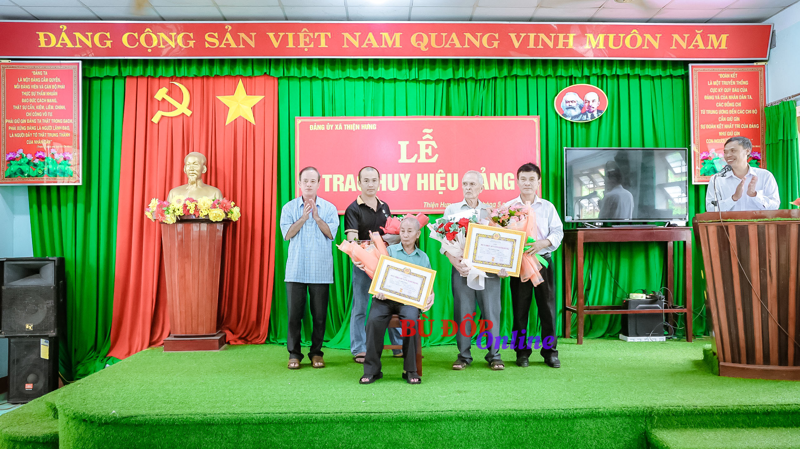 Sáng ngày 28-5, Đảng ủy xã Thiện Hưng huyện Bù Đốp tổ chức lễ trao tặng Huy hiệu 60 năm, 40 năm tuổi Đảng cho 3 đảng viên đợt 19-5. Tỉnh ủy viên, Bí thư Huyện ủy Bù Đốp Dương Thanh Huân dự trao huy hiệu; cùng dự có UVBTV, Trưởng ban tổ chức Huyện ủy Chung Văn Hoan; đảng ủy xã Thiện Hưng và các đồng chí đảng viên cao tuổi đảng nhận huy hiệu.