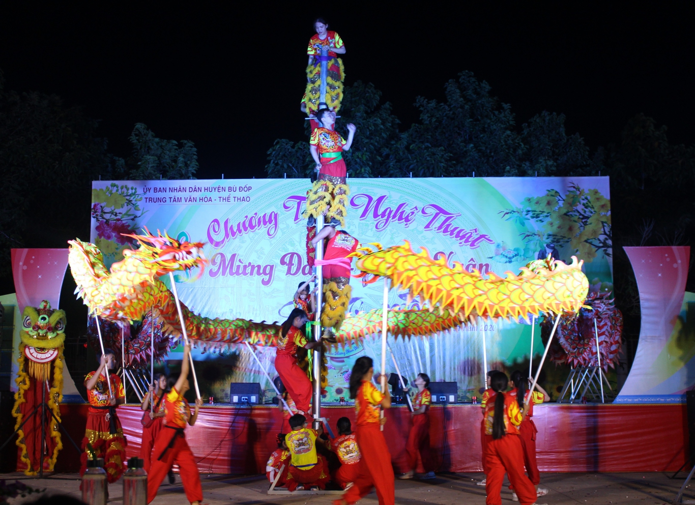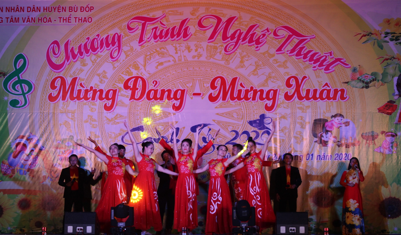 Chương trình nghệ thuật với chủ đề Mừng đảng - Mừng xuân gồm các tiết mục chào mừng Đảng quang vinh mừng Xuân thắng lợi, mừng đất nước đổi mới, ca ngợi Bác Hồ kính yêu, ca ngợi quê hương đất nước và về vùng đất quê hương Bù Đốp do các anh, chị em diễn viên không chuyên biểu diễn. Bên cạnh đó còn có tiết mục múa Lân sư rồng biểu diễn phục vụ đông đảo nhân dân, đã tạo không khí vui tươi, phấn khởi cho nhân dân trong toàn huyện trước thềm năm mới Xuân Canh Tý 2020.