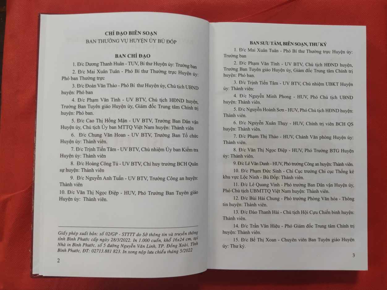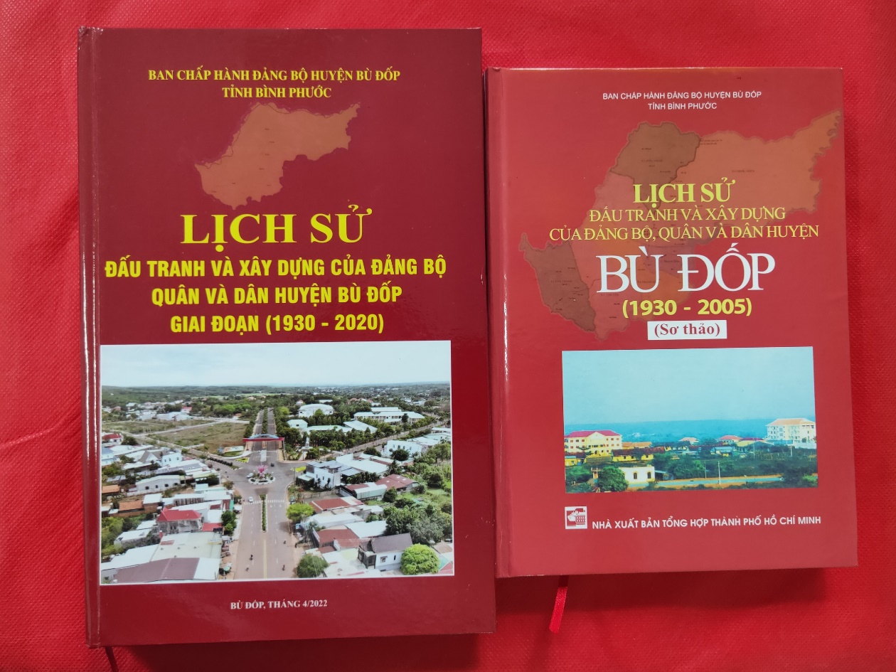 Sau 01 năm tổ chức nghiên cứu, biên soạn với sự hỗ trợ, cộng tác nhiệt tình, trách nhiệm của các đồng chí nhân chứng là các đồng chí trực tiếp tham gia các cuộc kháng chiến, đấu tranh bảo vệ toàn vẹn lãnh thổ trên chiến trường thuộc huyện Bù Đốp ngày nay, các đồng chí nguyên cán bộ lãnh đạo huyện, cán bộ tham gia công tác trên địa bàn huyện qua các thời kỳ. Tại Lễ Kỷ niệm 50 năm ngày giải phóng Bù Đốp (07/4/1972 - 07/4/2022) và 19 năm huyện Bù Đốp được thành lập và chính thức đi vào hoạt động (01/5/2003 - 01/5/2022) diễn ra vào ngày 05/4/2022, Ban Chấp hành Đảng bộ Huyện đã giới thiệu và phát hành ấn phẩm “Lịch sử đấu tranh và xây dựng của Đảng bộ, Quân và Dân huyện Bù Đốp (giai đoạn 1930 - 2020)”(2).