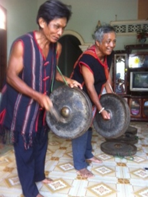 | Ông Điểu Srem (Trái) bên bộ Cồng chiêng |