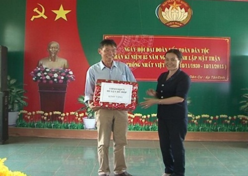 | Bà Cao Thị Hồng Mận chủ tịch UBMT TQVN huyện tặng quà cho BĐH ấp Tân Định. |