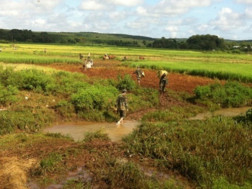 | Đoàn viên khối LLVT giúp dân thu hoạch mùa lúa |
