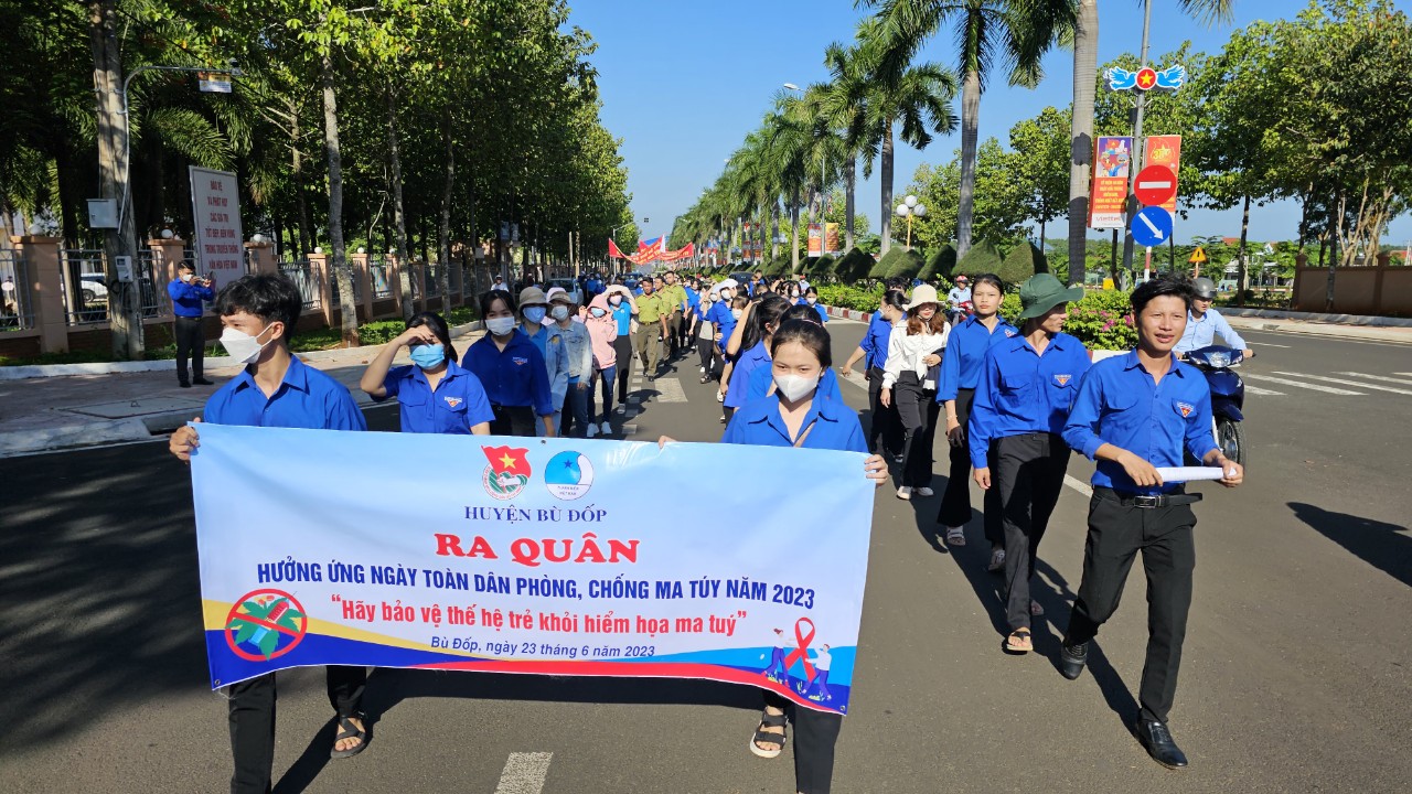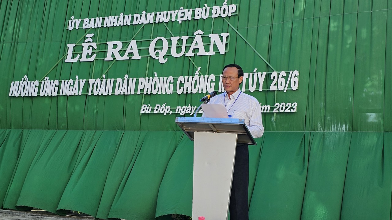 Phát biểu tại lễ mít-tinh, đồng chí Lê Quang Oanh Chủ tịch UBND huyện Bù Đốp nhấn mạnh: hiện nay tình hình tội phạm và tệ nạn ma túy diễn biến phức tạp, dẫn đến nguy cơ tỷ lệ người nghiện ma túy ngày càng cao. Để nâng cao chất lượng, hiệu quả công tác phòng chống ma túy trong thời gian tới, UBND huyện chỉ đạo các ban, ngành huyện, xã, thị trấn tiếp tục thực hiện công tác tuyên truyền phổ biến, giáo dục pháp luật về công tác phòng tội phạm, Phòng chống ma túy; chỉ đạo các Trường học phối hợp với gia đình quản lý chặt chẽ học sinh không để tình trạng học sinh sử dụng thuốc lá điện tử hoặc sử dụng trái phép chất ma túy.